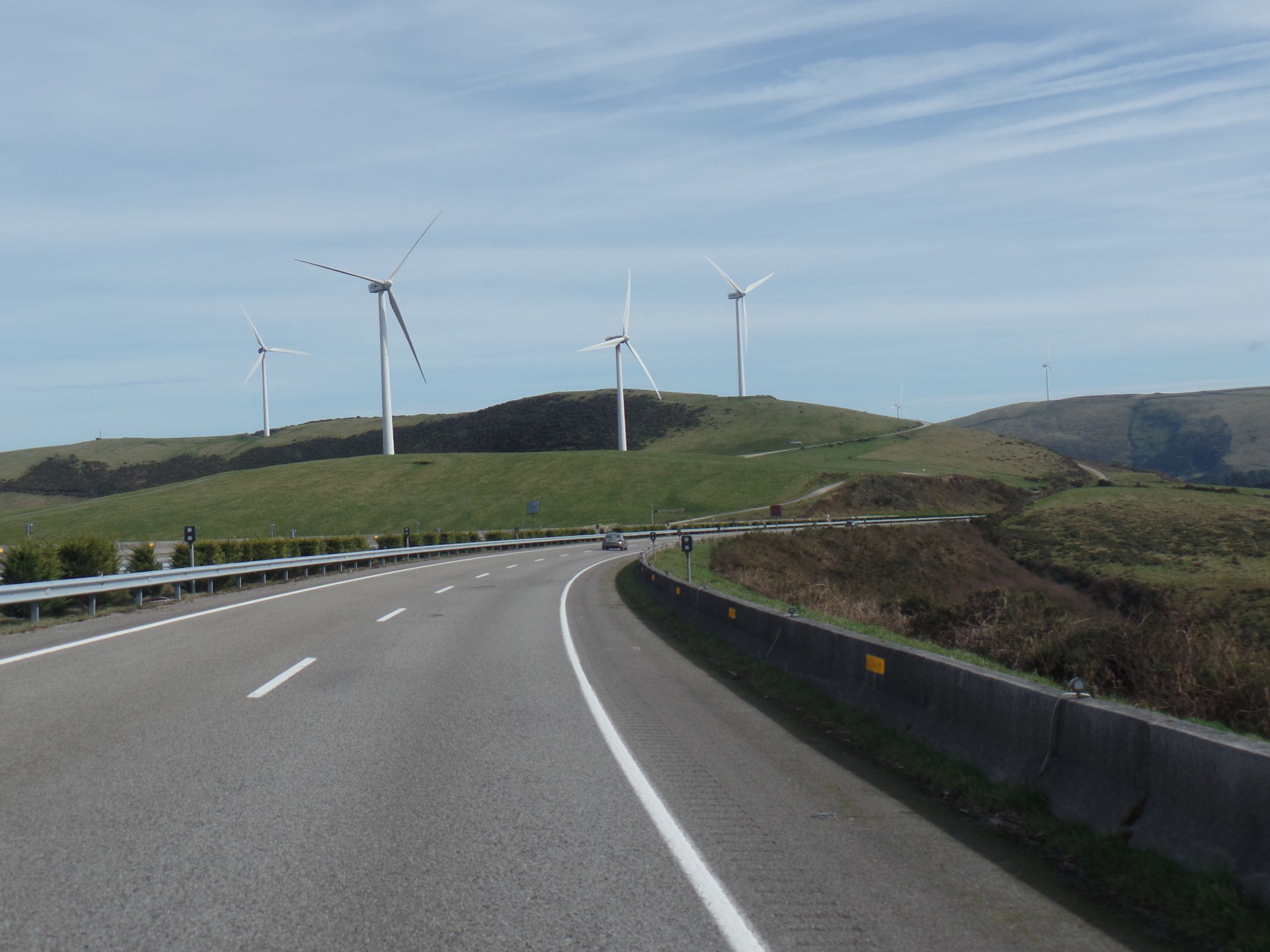 Kurz vor der Küste überquerten wir noch eine kleine Bergkette, mit wenig Vegetation und einigen Windrädern. Spanien besitzt angenehm wenige Windräder, die die Landschaft verschandeln. Wenn, dann stehen sie auf den Bergen.