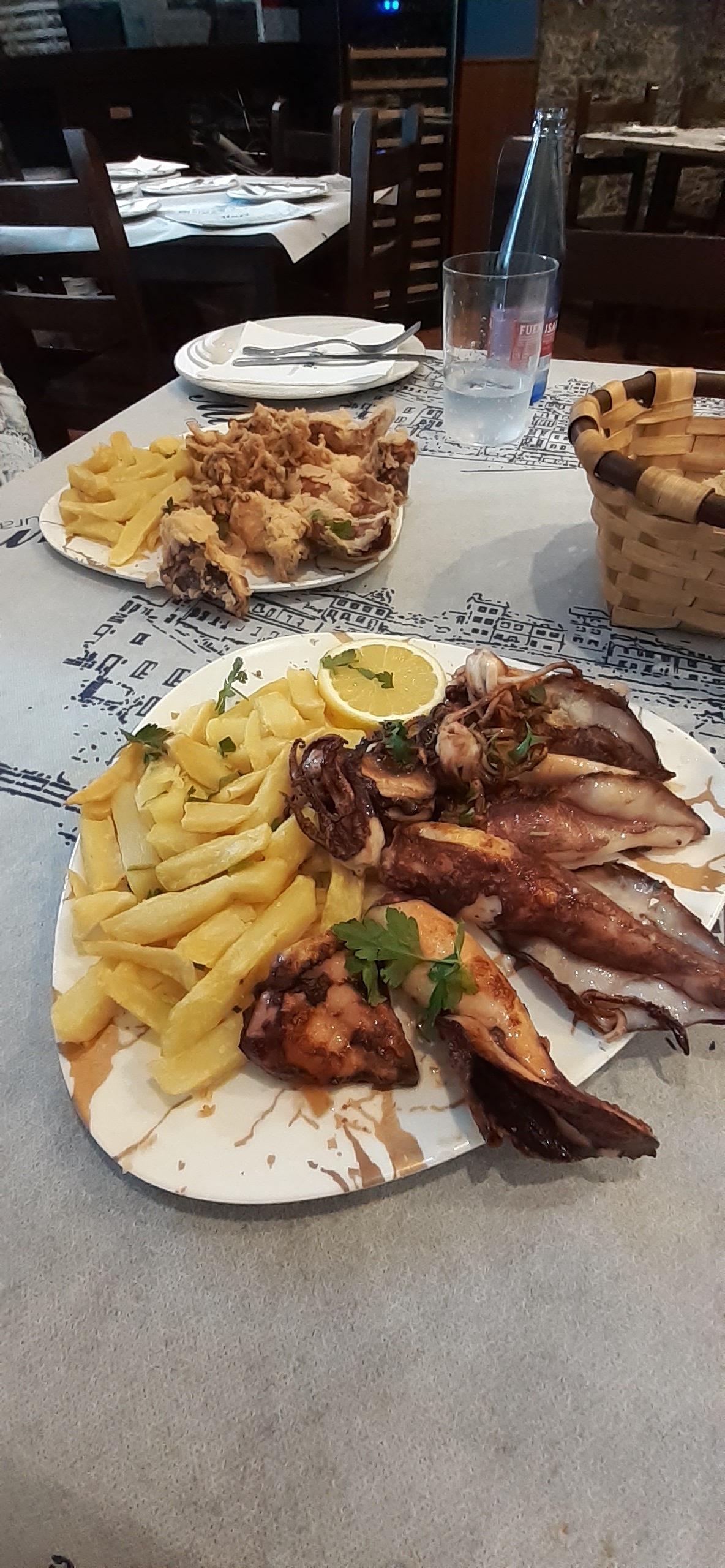 Jetzt hatten wir Appetit auf eine asturische Spezialität: Chipirones. Das Ambiente und das Wetter passten gerade, also kehrten wir in die „Casa Mari Sidrería-Restaurante“ ein. Das Haus liegt ziemlich versteckt und ist sehr gemütlich. Wir bestellten Chipirones (Babytintenfisch) fritos (frittiert) und plancha (gegrillt). Bekommen haben wir große Portionen, die sehr appetitlich aussahen und super schmeckten. Für die zwei Portionen, leckeres Brot, ein Wasser und ein Bier bezahlten wir 40,-€, was ziemlich preiswert ist.