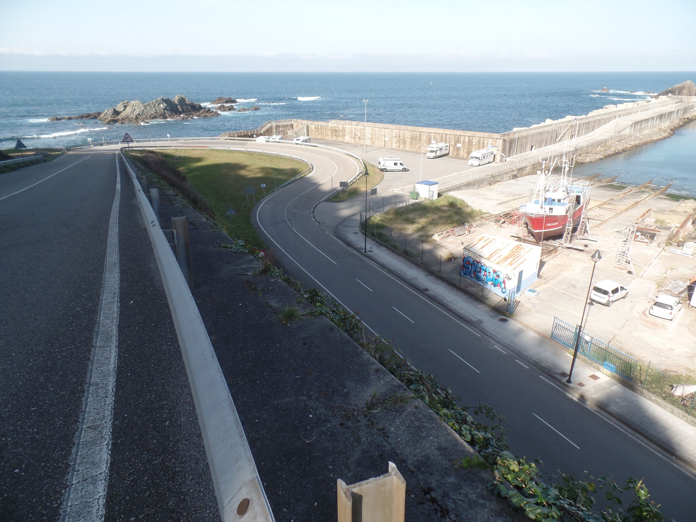 Zum Fluss Navia sind es nur ein paar Schritte. Direkt rechts der Werft, wo gerade zwei Schlepper gebaut werden, beginnt ein schöner Weg am Flussufer entlang hin zum Meer. Seit Foz bewegen wir uns an der Costa Verde Nordspaniens, einem Teil der Biskaya.