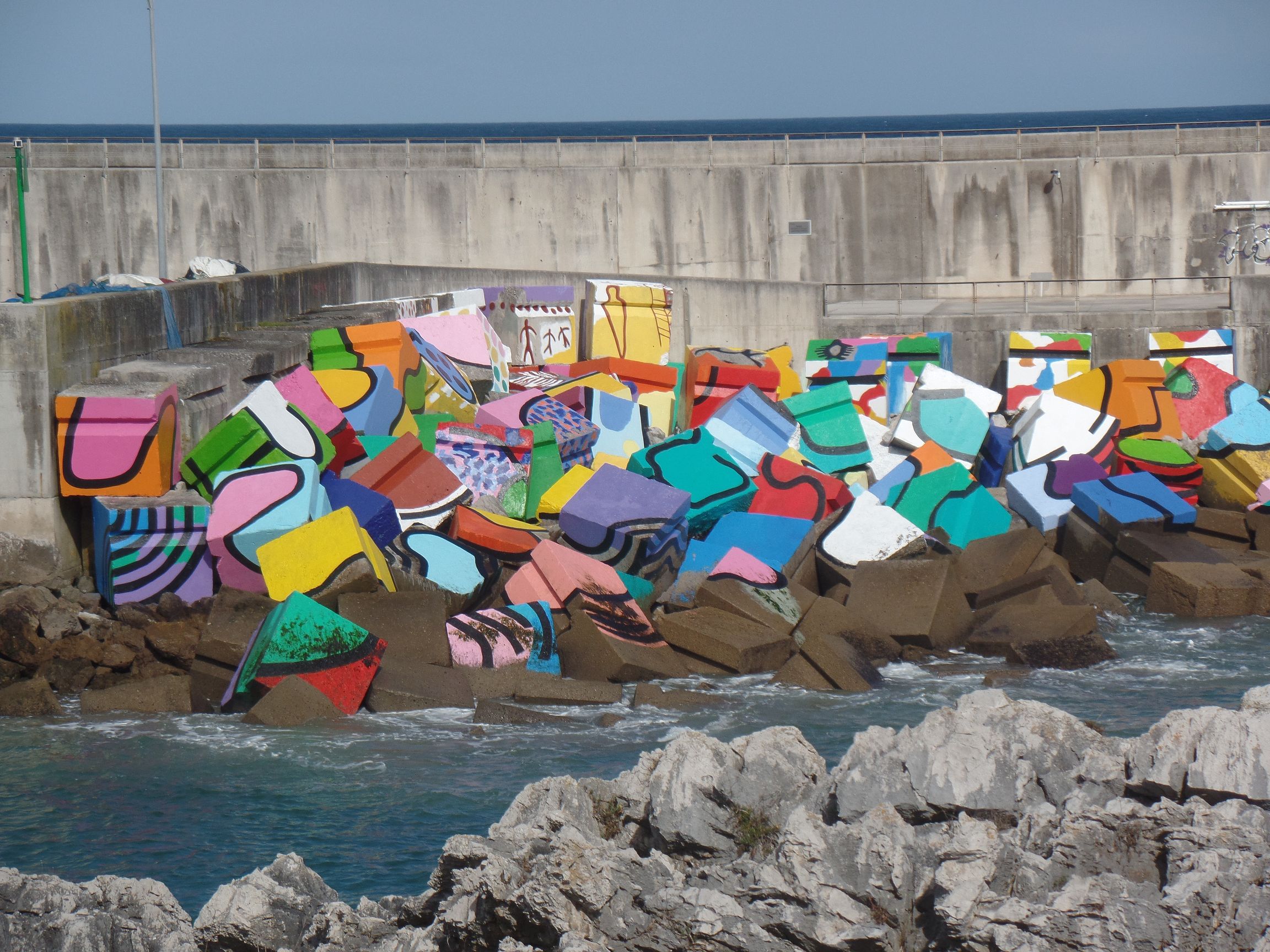 Wir hatten von den „Los Cubos de la Memoria“ erfahren, allerdings auch, dass diese Erinnerungswürfel von der gegenüberliegenden Seite besser zu sehen sein sollen. Diese Erinnerungswürfel befinden sich an der Spitze der nördlichen Begrenzung der Hafeneinfahrt. Sie wurden von einem baskischen Maler geschaffen und sollen an die kulturelle Vergangenheit der Stadt Llanes erinnern, sowie an die Kunst und die Region.