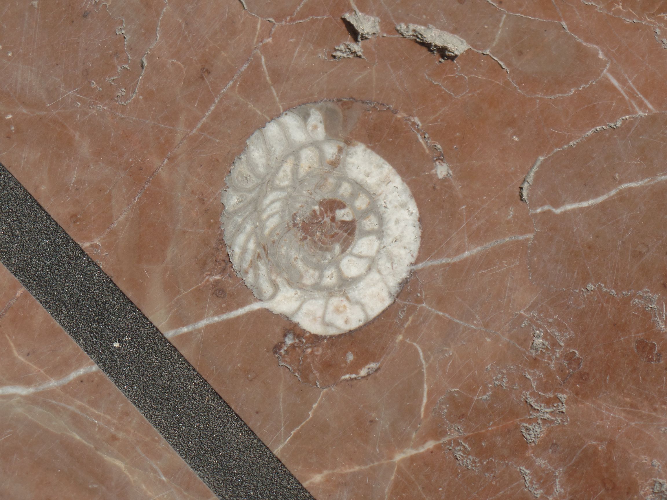 Steigt man die Stufen rechts vom Turm hoch, erreicht man die Basilica de Santa María del Concejo“. In einer der Stufen zum Eingang der Basilica fanden wir einen in den roten Marmor eingeschlossenen Ammoniten.