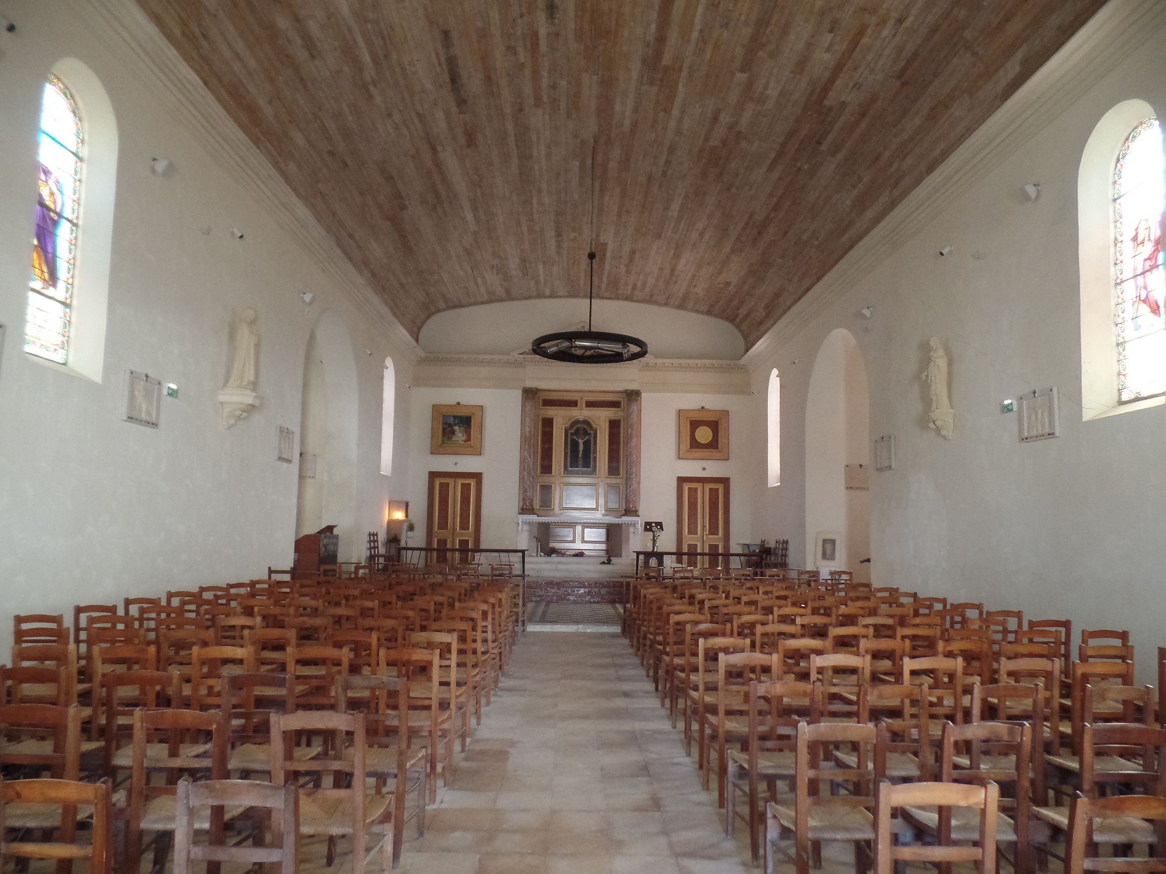 Die Kirche ist innen auch sehr schlicht, besitzt jedoch eine Decke, die mit Holzplanken verkleidet ist, oder nur so aussieht. Seitlich besitzt die Kirche einen ungewöhnlichen Anbau im neoklassizistischen Stil.