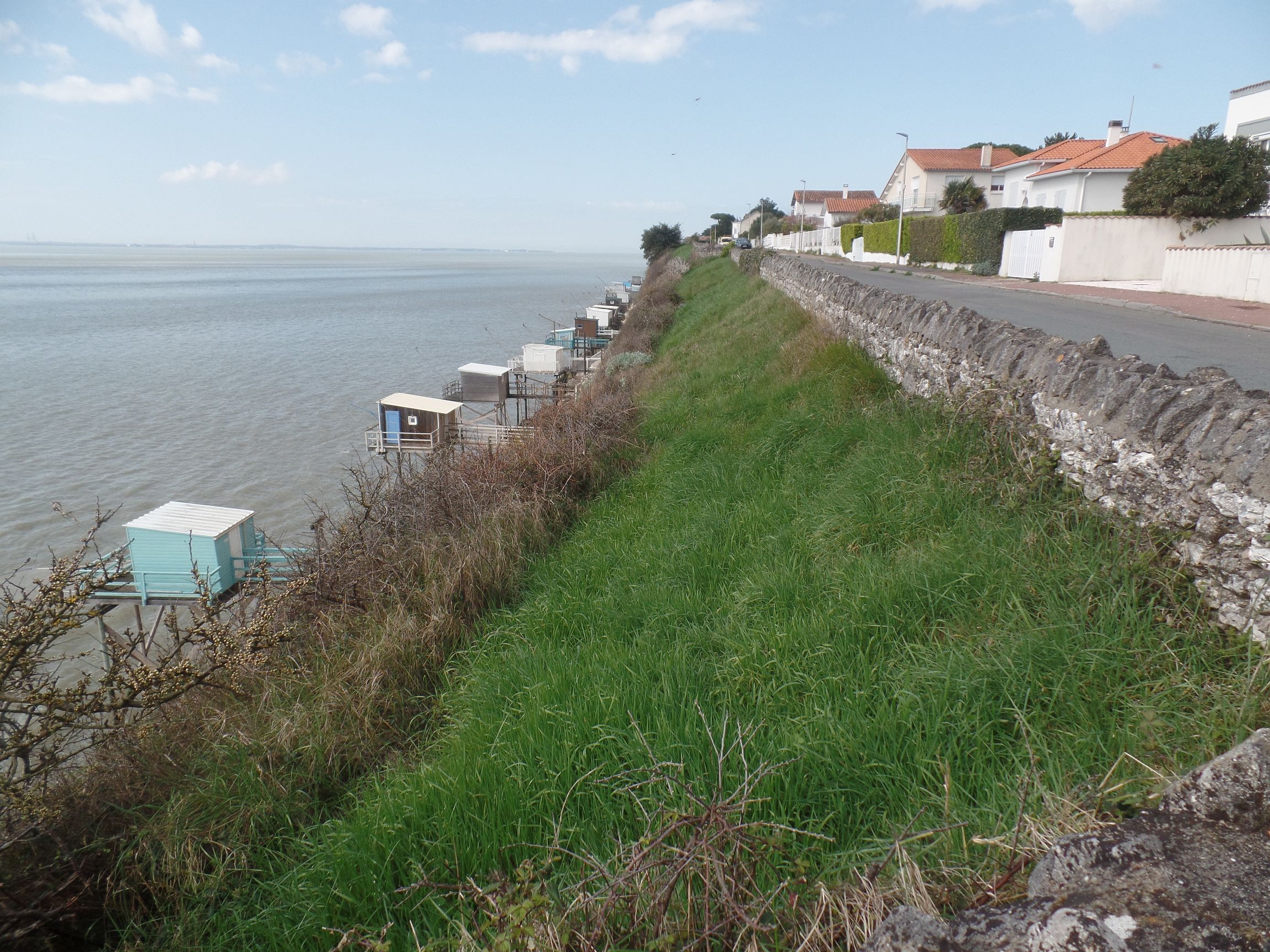 Unseren Rundgang beendeten wir, indem wir auf der Küstenstraße weiter spazierten. Auf der einen Seite stehen schöne Villen, auf der anderen Seite wieder die Fischerhütten auf Stelzen. Es ist wirklich sehr schön in Meschers-sur-Gironde.