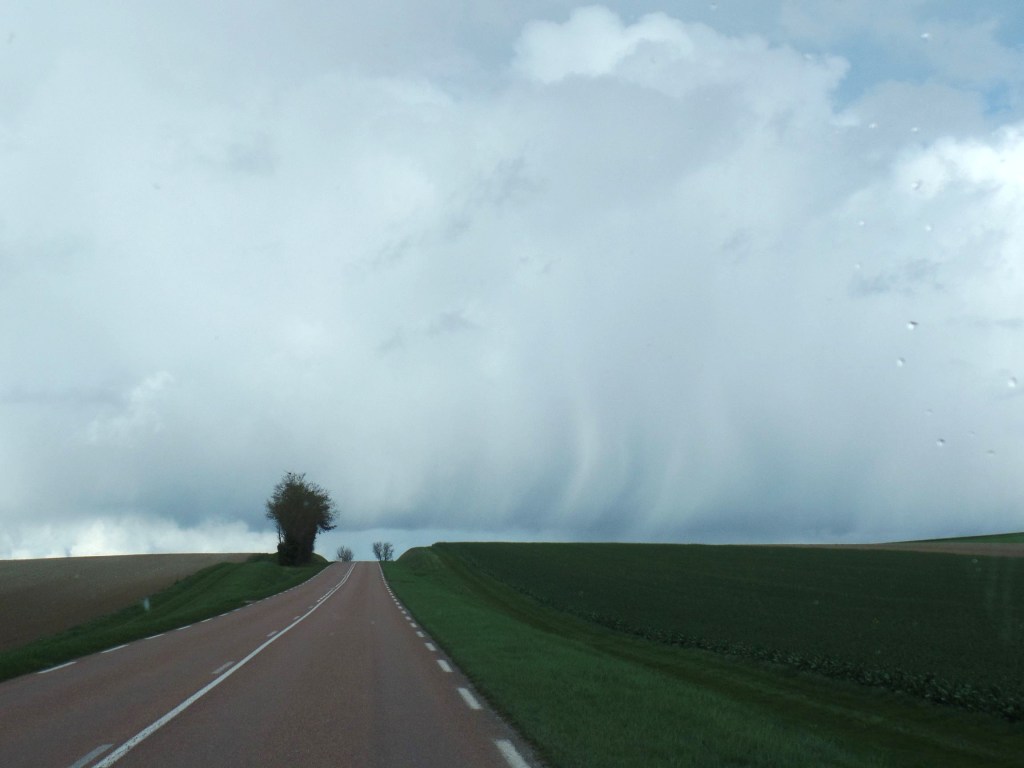 Unterwegs hatte sich am Himmel eine Rollwolke, oder „Wolkenwalze“, aufgebaut. Solch eine Wolke kannten wir nur aus einer Filmserie im Fernsehen, die an einer Küste spielt. Um so überraschter waren wir, solch eine seltene Wolke mitten auf dem Land zu treffen. Wie wir feststellen mussten, sieht sie nicht nur bedrohlich aus, sondern sie ist ein Zeichen für Gewitter oder Kaltfronten. In unserem Fall hatte sie gerade einen Graupelschauer gebracht. Über alles hatte sich eine dünne Schicht Graupelkörner gelegt.