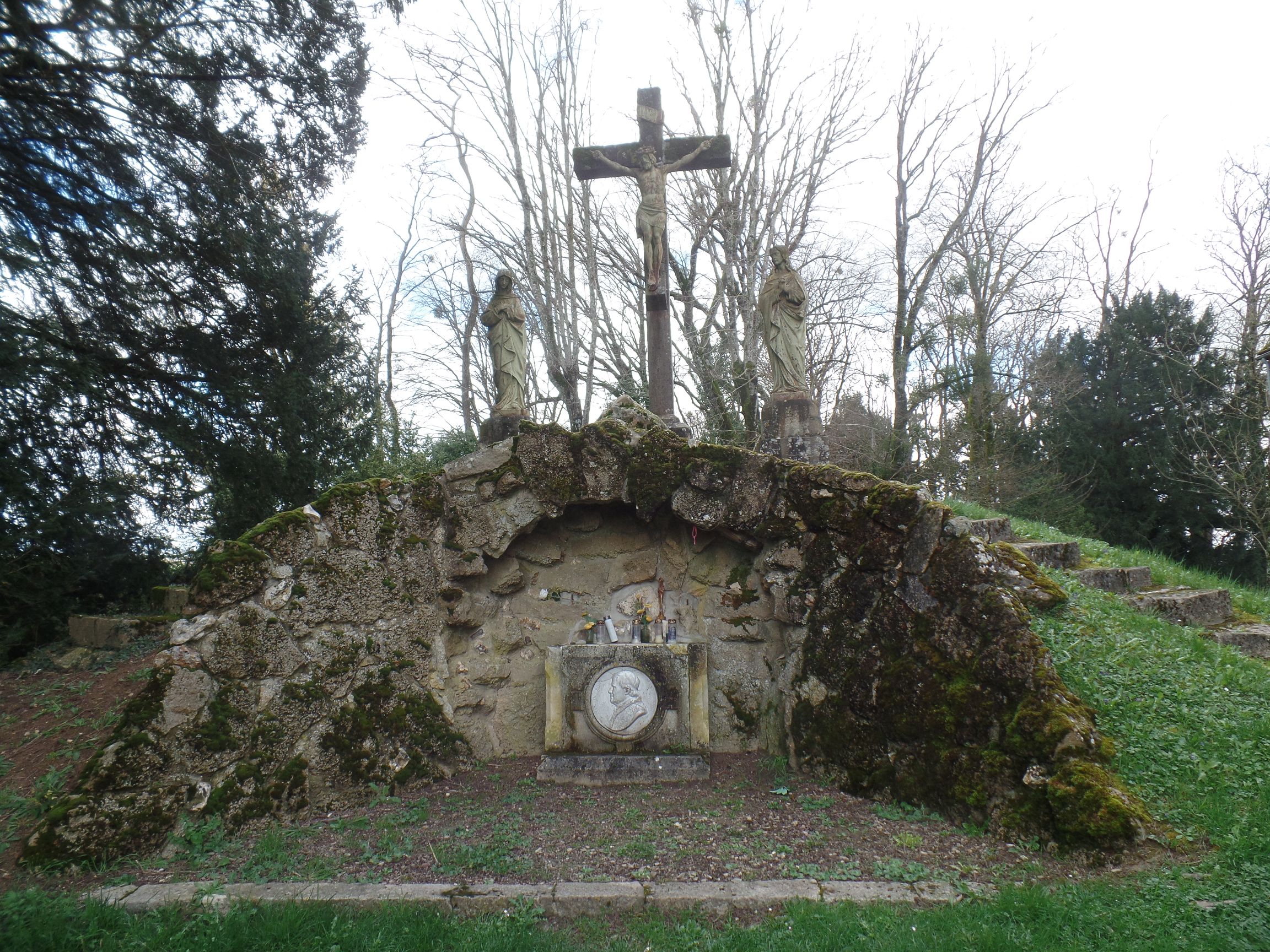 Hinter dem Kalvarienkreuz, welches sich neben der Kapelle erhebt, ist das Grab des Abtes Cardot versteckt.