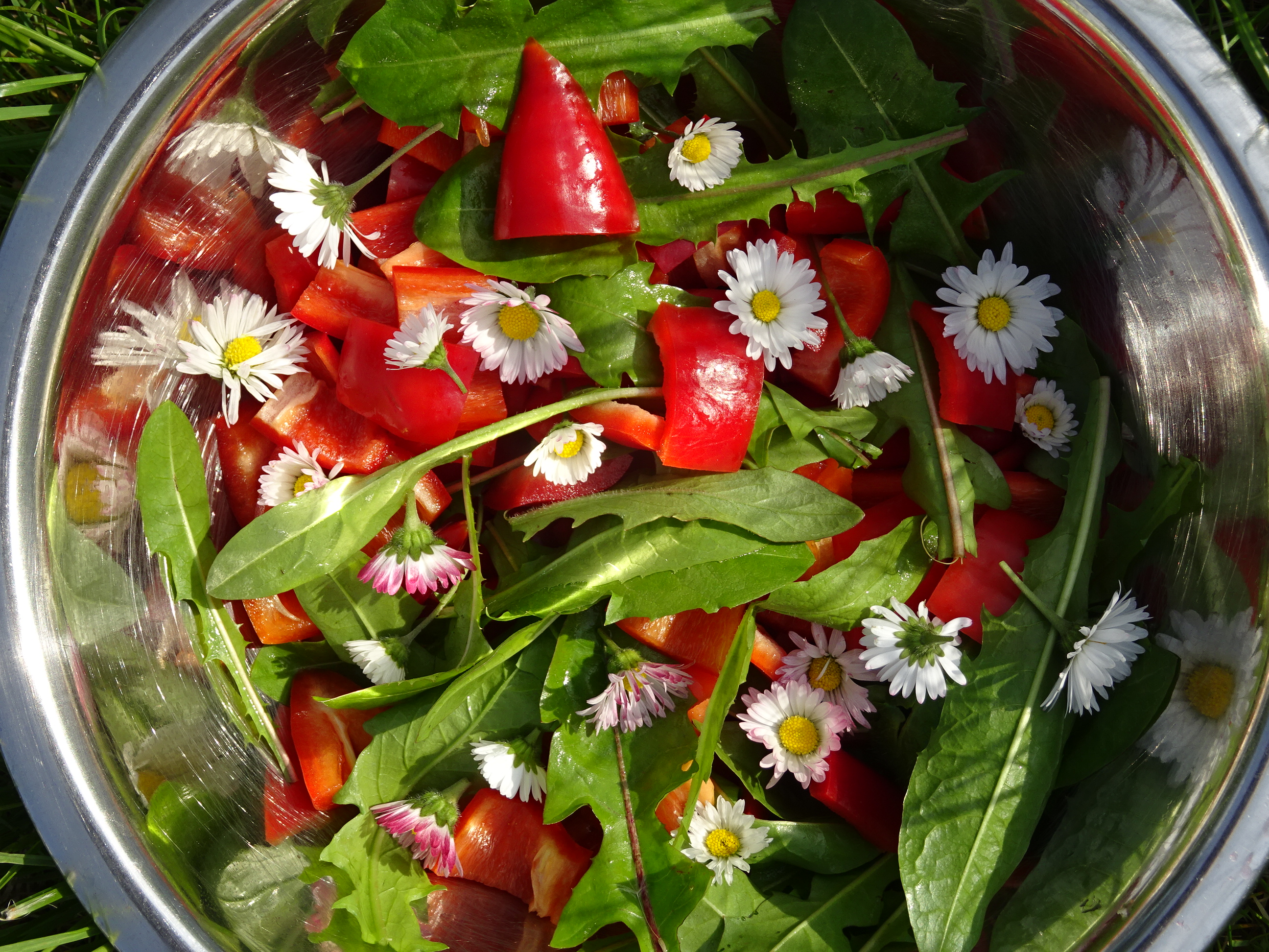 Roten Spitzpaprika in mundgerechte Stücke schneiden und mit jungen Löwenzahnblättern mischen, Dazu ein Dressing Eurer Wahl, vielleicht etwas mit Honig, darübergeben. Zuletzt mit reichlich Gänseblümchen garnieren. Sieht gut aus und schmeckt lecker.