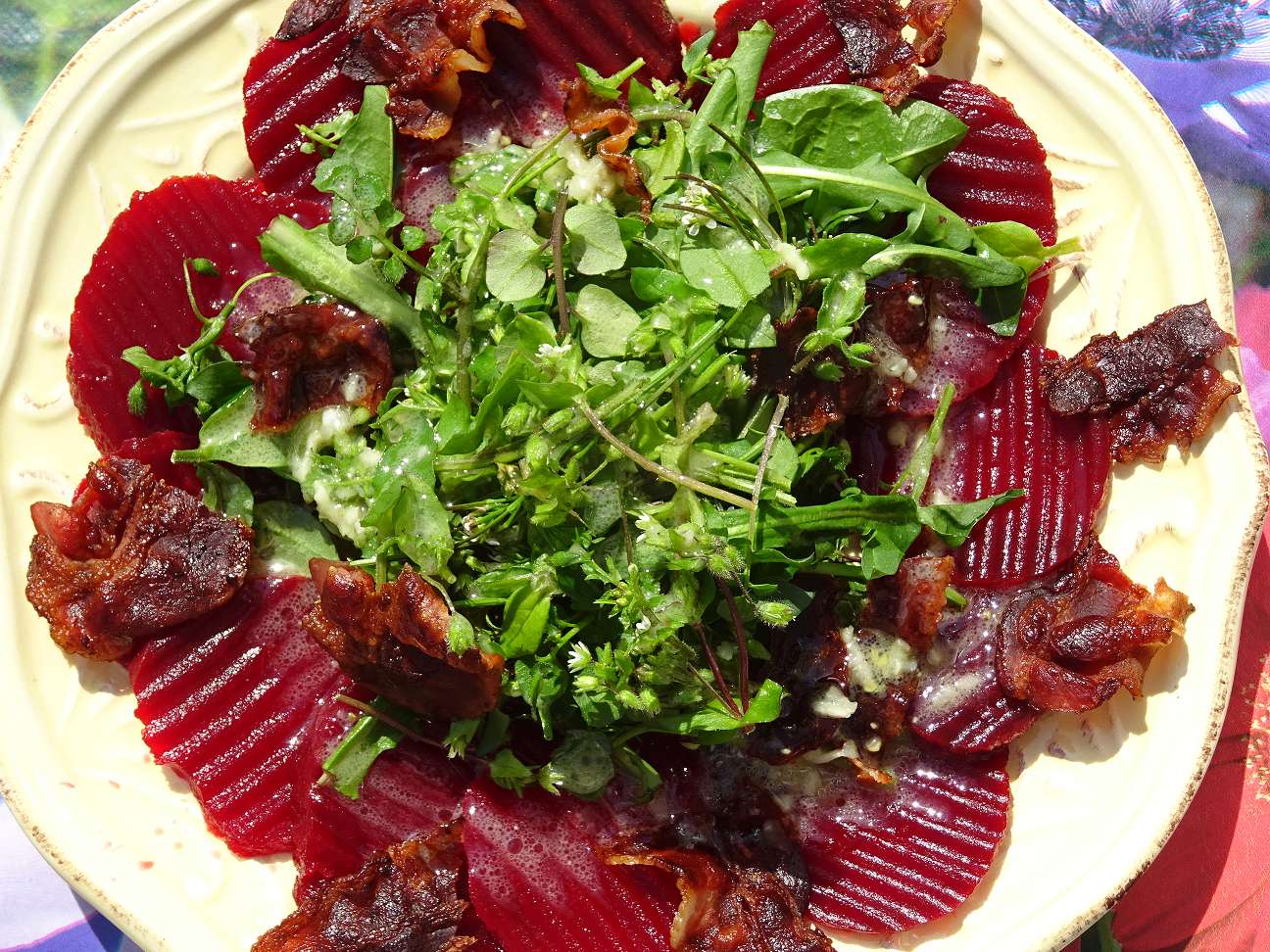 Vogelmiere (die grüne, nicht die mit den roten Stängeln), etwas Bitterkresse und Löwenzahnblätter gut waschen und schonend abtrocknen. Z.B. auf Rote Beete Capaccio verteilen. Salatsoße aus Knobi, Senf, Zitronensaft und Sonnenblumenöl herstellen und über den Salat träufeln. Zum Schluss mit krossem Bacon garnieren. Das ist ein schöner leichter Salat vom Frühjahr bis in den Spätsommer.