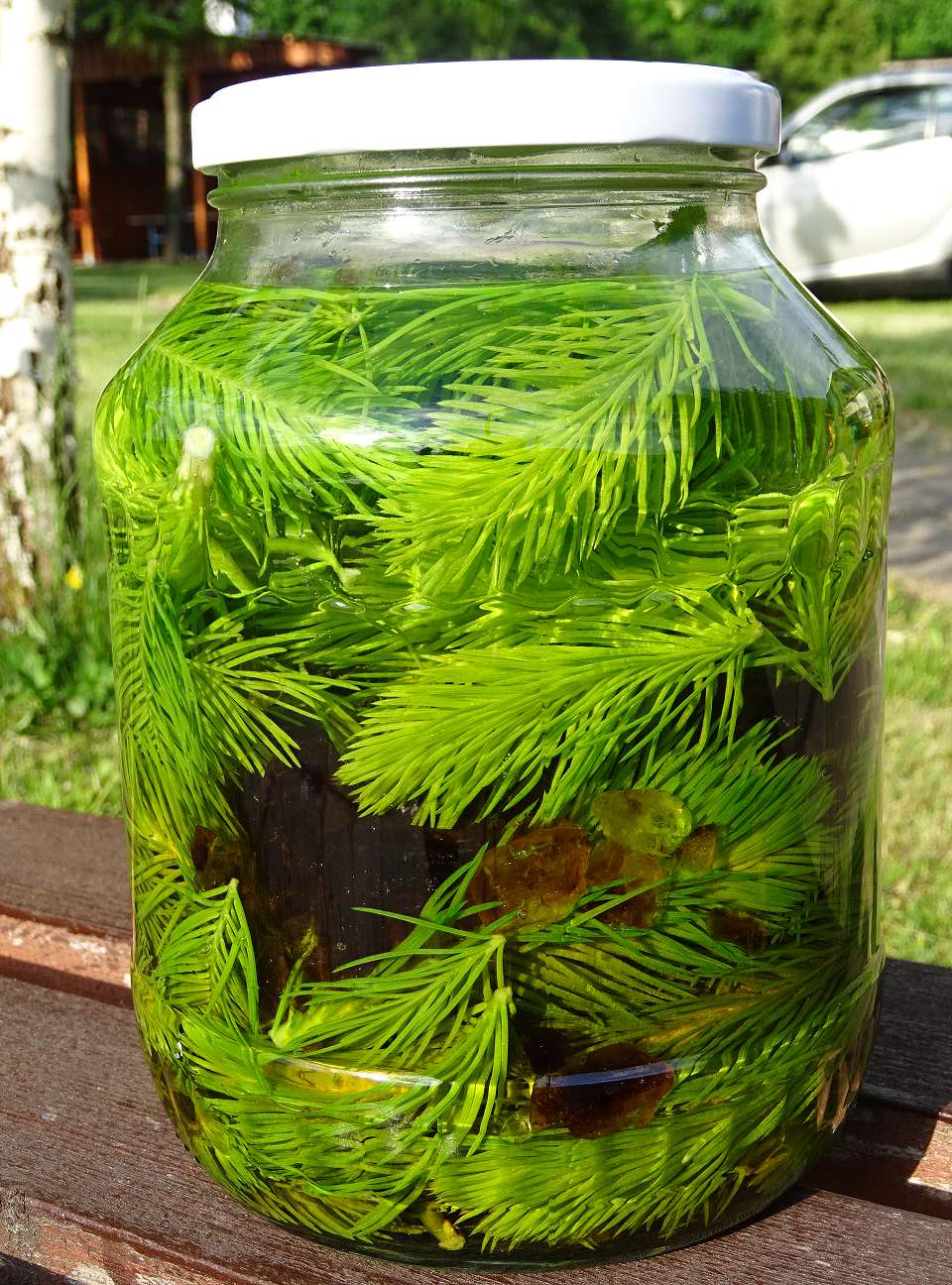 3-4 handvoll hellgrüne frische Tannenspitzen, 0,7l Gin 40%, 120-130g brauner oder weißer Kandiszucker
