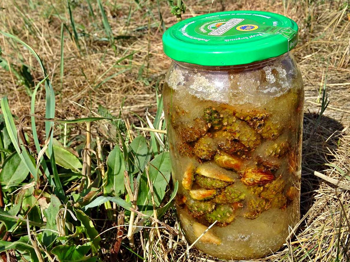 Grüne Kiefernzapfen bis 3cm Länge (können Ende Mai bis Ende Juni gesammelt werden), brauner Rohrzucker