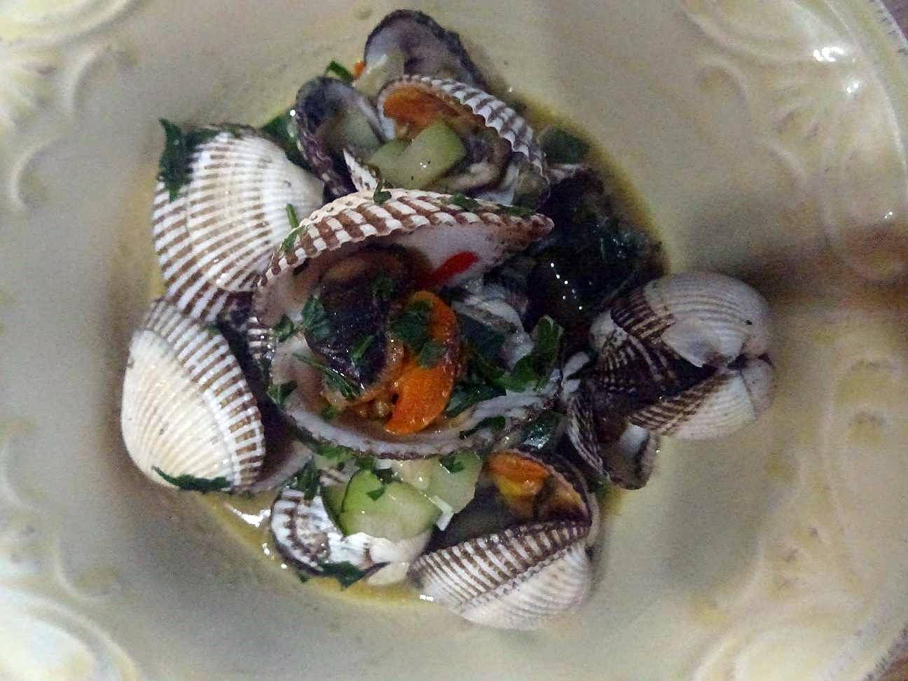 Herzmuscheln, Olivenöl, feingeschnittene Zwiebel und Knoblauch, etwas Chilli, kleine Zucchiniwürfel, Weißwein, Sahne, Petersilie
