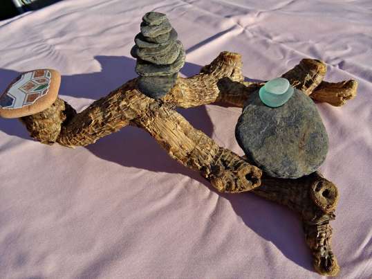 Nun fehlt noch ein runder flacher Stein in der Mitte, etwa 8-9cm im Durchmesser, und ein beliebiger Stein darunter. Beide Steine werden in der Mitte des Windspieles mit einem wetterfesten Faden, Angelsehne o.ä., am oberen Brett festgemacht (siehe Foto). Dafür ist ein weiteres kleines Loch in der Mitte des Brettes nötig. Wir haben ein am Strand gefundenes Plastikteil verwendet, welches mit Sprühkleber und Sand beschichtet wurde. Leider war nur grauer Sand verfügbar.