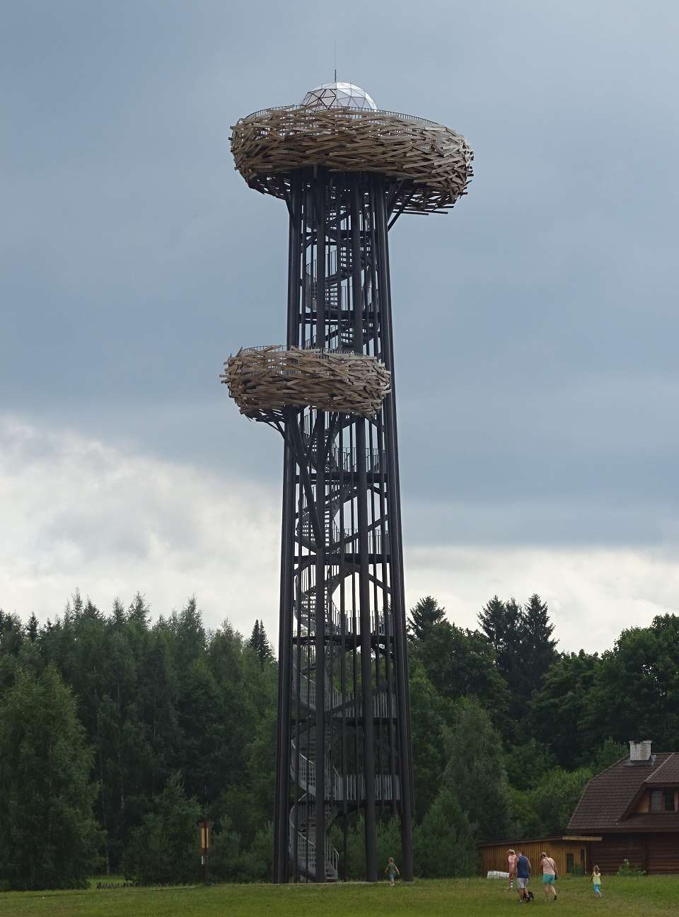 Einen Besuch lohnt auch der Ort Rõuge, westlich vom Suur Munnamägi. Hier lockt ein besonderer Aussichtsturm mit zwei Plattformen. Bis 2015 stand ein hölzerner Turm an der Stelle, bevor er 2016 ersetzt wurde. Der neue Turm sieht aus, als würde er zwei Storchennester tragen.