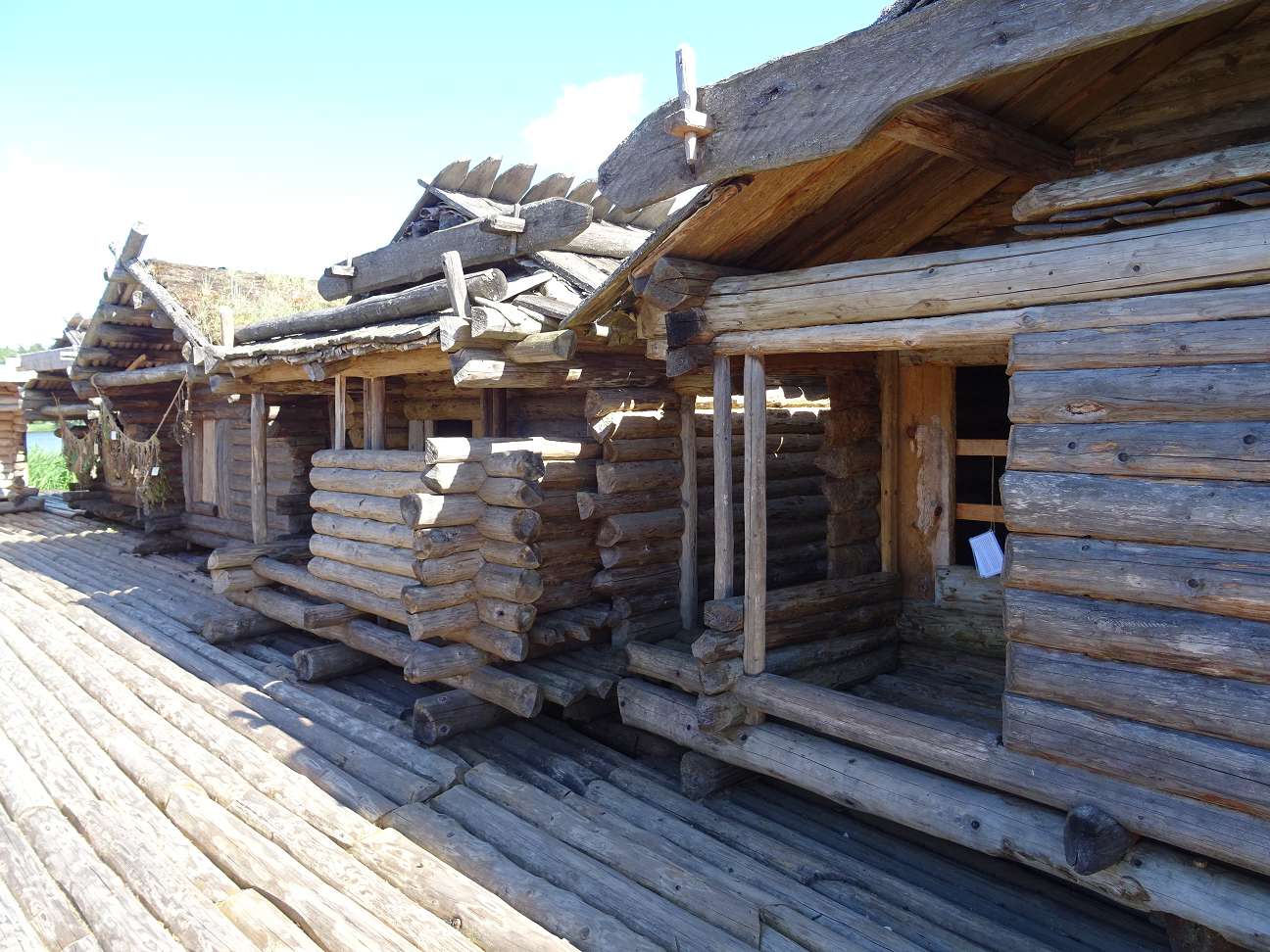 Links von der Burg entstand die Rekonstruktion einer Inselsiedlung aus dem 9.-10. Jahrhundert. Zehn dieser Inselsiedlungen sind inzwischen auf dem Gebiet Lettlands bekannt. Diese hier im Āraiši-See wurde von dem altlettischen Stamm der Lettgalen erbaut. Es ist die einzige Rekonstruktion solch einer Inselsiedlung, bei deren Errichtung man sich Daten und Fundstücke aus allen zehn Ausgrabungen zu Hilfe genommen hat. Das Ergebnis kann sich sehen lassen. Die ganze Siedlung steht auf einer Plattform aus Rundhölzern, die auf einer Sandbank im See ruht. Darauf wurden die kleinen Wohnhäuser aus Rundhölzern gebaut, die nur einen Raum und einen kleinen Vorbau hatten. Vermutlich wurden die Fußböden mit Lehm begradigt, denn auf den Rundhölzern lässt es sich nicht wirklich gut gehen. Kleine Lehmöfen in den Wohnräumen dienten als Heizung und Herd.