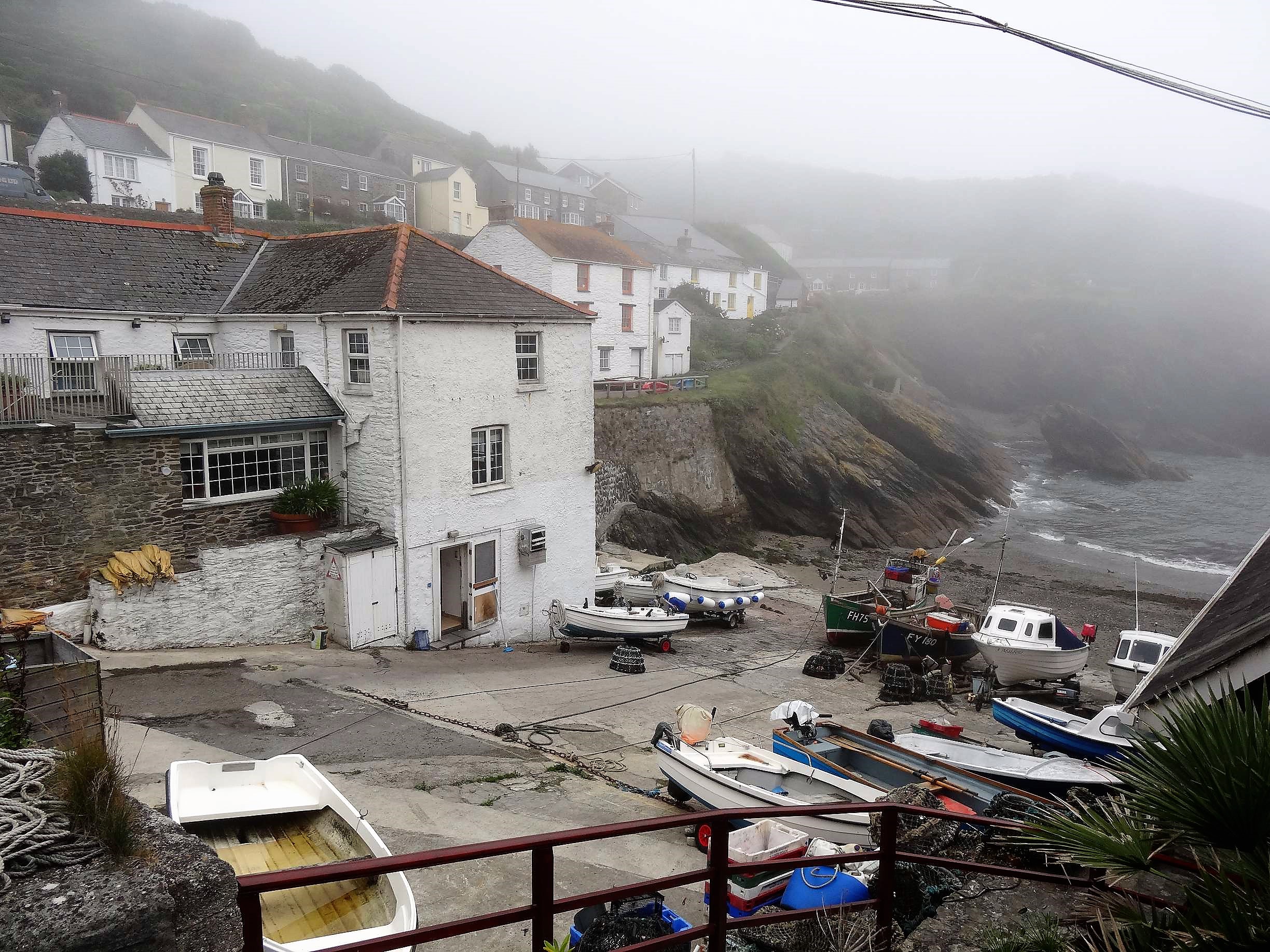 Portloe ist ein winziges Nest, eingeschlossen in eine winzige Felsenbucht. Der kleine Hafen ist wegen Überfüllung durch die Einheimischen geschlossen, die Hotels und Kneipen haben zu wenig Gäste, so scheint es jedenfalls. Es ist echt idyllisch, bei schönem Wetter. Der Nebel hatte Portloe jedoch immer noch im Griff.