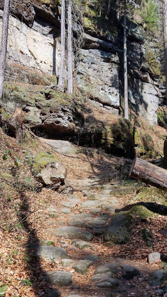 Kurz dahinter führt eine kleine Brücke über die Polenz und der Weg führt wieder zurück. Aber oh weh, nicht wieder am Flüsschen entlang, sondern sehr steil die ganzen 300m hoch auf die Oberseite der Sandsteinfelsen. Der Weg ist zwar sehr interessant, was die Landschaft angeht, aber ich bewältigte den Aufstieg mehr stehend als gehend. Die Naturbelassenheit des Weges macht das Gehen auch nicht einfacher. Seit mehr als drei Jahren bin ich eine Flachlandtirolerin ohne jede Kondition. Das war echt hart, aber es ging mir nicht alleine so. Das war ein Trost für mich.