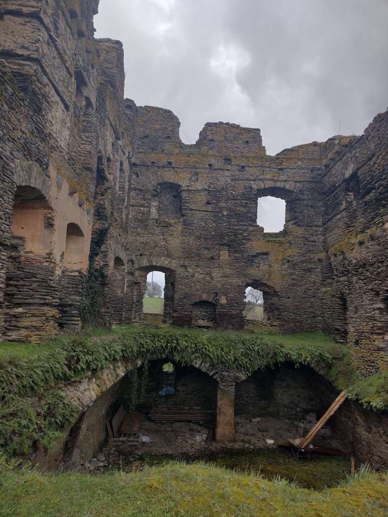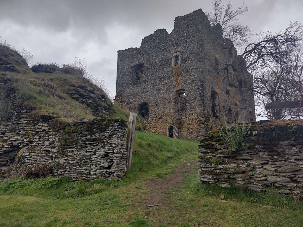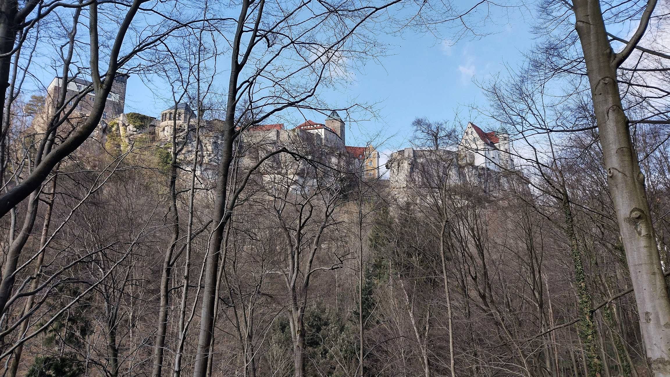 Eigentlich wollte ich den „Malerweg“ am Rande des Plateaus und damit am Rande der Schlucht nehmen, aber irgendwie habe ich ihn nicht gefunden. Stattdessen führt ein anderer Weg quer über das Plateau, bis zur imposanten Burg Hohnstein. Majestätisch thront sie über dem Wanderweg. Ein Stück der alten Burgmauer unterhalb im Wald ist noch erhalten. Hier startet ein Lehrpfad, der die Wanderer bis nach unten zur Polenztalmühle begleitet. Auf einem der Schilder ist zu lesen, dass diese Mauer von 1609 bis Mitte des 18. Jahrhunderts die Begrenzung eines Bärengartens war. Die Bären wurden hier im Wald gehalten und für Tierhatzen nach Dresden gebracht, damit sich er kurfürstliche Hof daran ergötzen konnte. Nur gut, dass dies seit langem der Vergangenheit angehört.