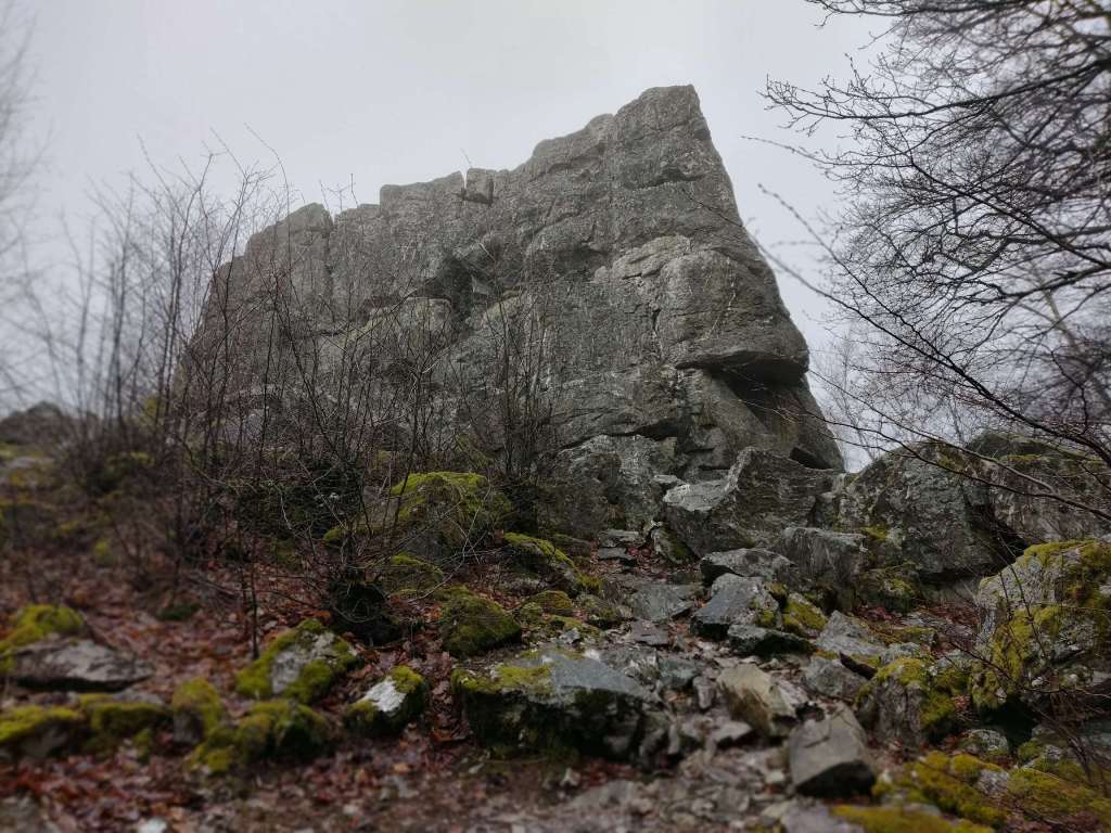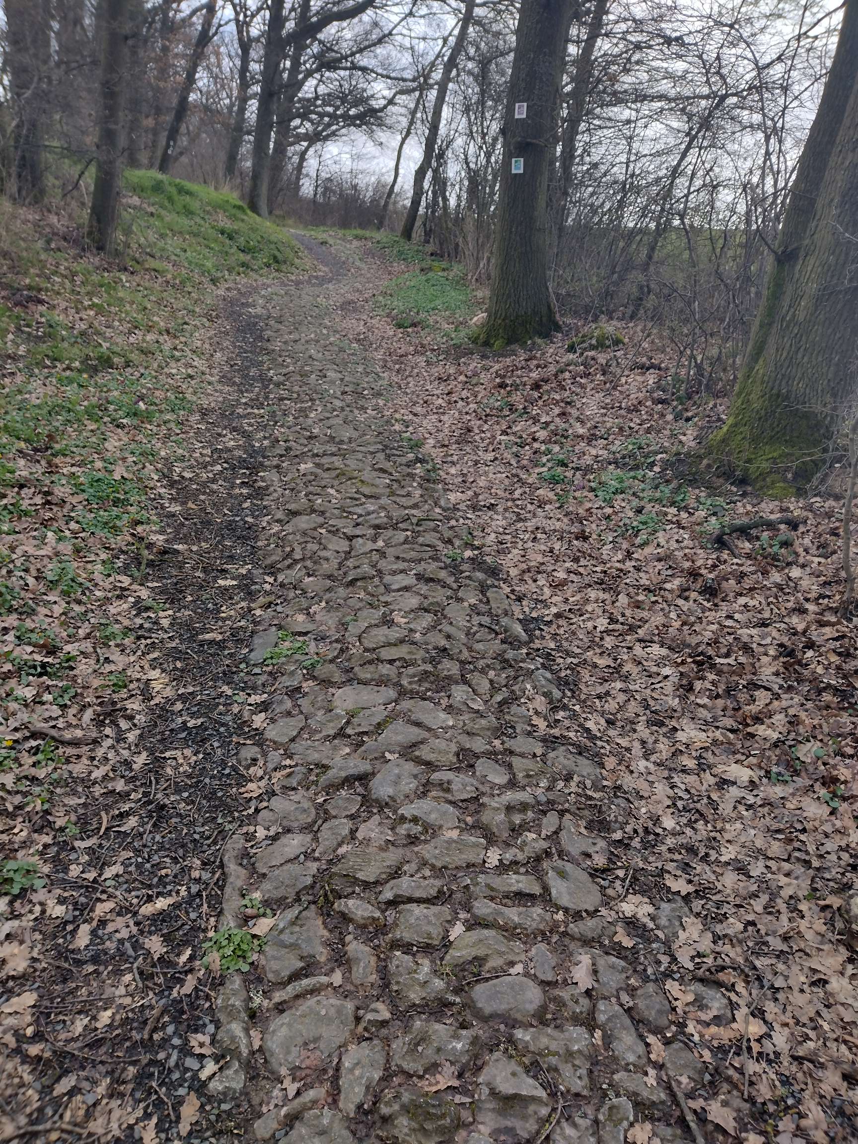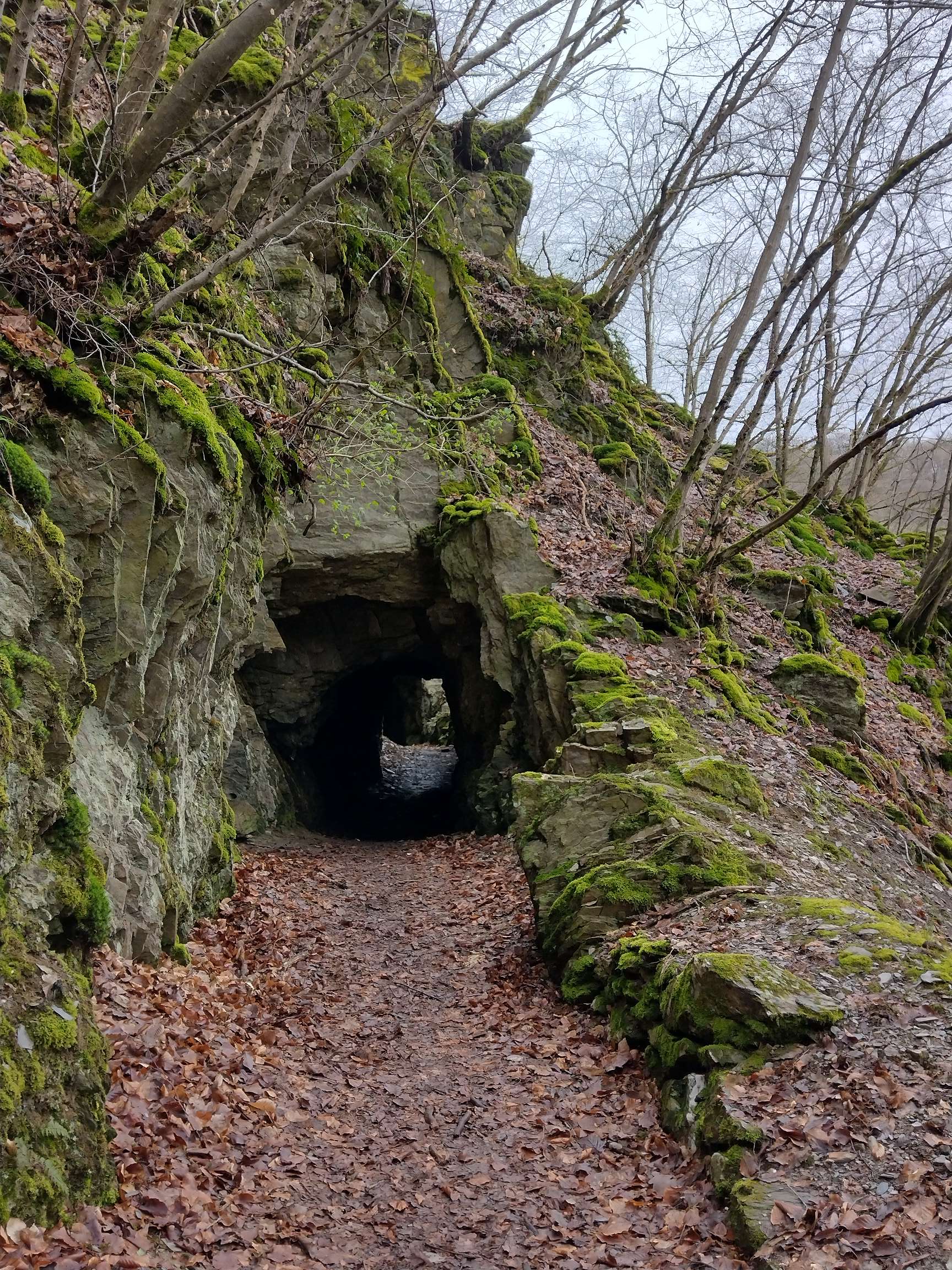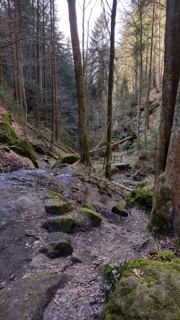 Nun ist es etwas schwierig den Weg zu finden, aber mit ein bisschen Geduld klappt das. Von nun ab geht es genauso steil, wie es hoch ging, wieder hinunter. Man muss sich seinen Weg über Stock und Stein bahnen und auch ein wenig klettern. Bald kommt man zu einer kleinen Sandstein-Brücke. Die lässt man links liegen und klettert, im wahrsten Sinne des Wortes weiter bergab. Nun führt der Weg immer durch den Schindergraben. Hier entsorgten 1546 die Abdecker, altdeutsch: Schinder, totes und todkrankes Vieh, um keine Seuchen aufkommen zu lassen. Ich will mir nicht vorstellen, wie das hier gestunken haben muss.