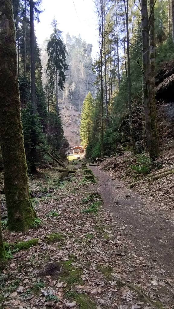 Klaus fuhr mich zur Polenztalmühle, wo einige der Wanderwege starten. Da Klaus nicht mitlaufen wollte, nahm ich zuerst den Weg im Tal, immer am Flüsschen Polenz entlang. Rechts und links des Weges ragen ca. 300m hohe Felswände aus Sandstein empor. Der Weg ist sehr idyllisch und gut zu gehen. Nach einer guten halben Stunde erreicht man die Waltersdorfer Mühle, wie die Polenztalmühle ein Ausflugslokal.