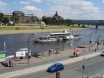 Am diesseitigen Terrassenufer legen die berühmten Raddampfer zu Fahrten Elb-auf über Pillnitz nach Bad Schandau und Elb-ab nach Meißen ab. Leider werden fast alle „Dampfer“ inzwischen mit Dieselmaschinen angetrieben. Nur noch die „Diesbar“ fährt unter Dampf und steht zudem unter Denkmalschutz. (siehe dazu auch den Kommentar von Martin K.)