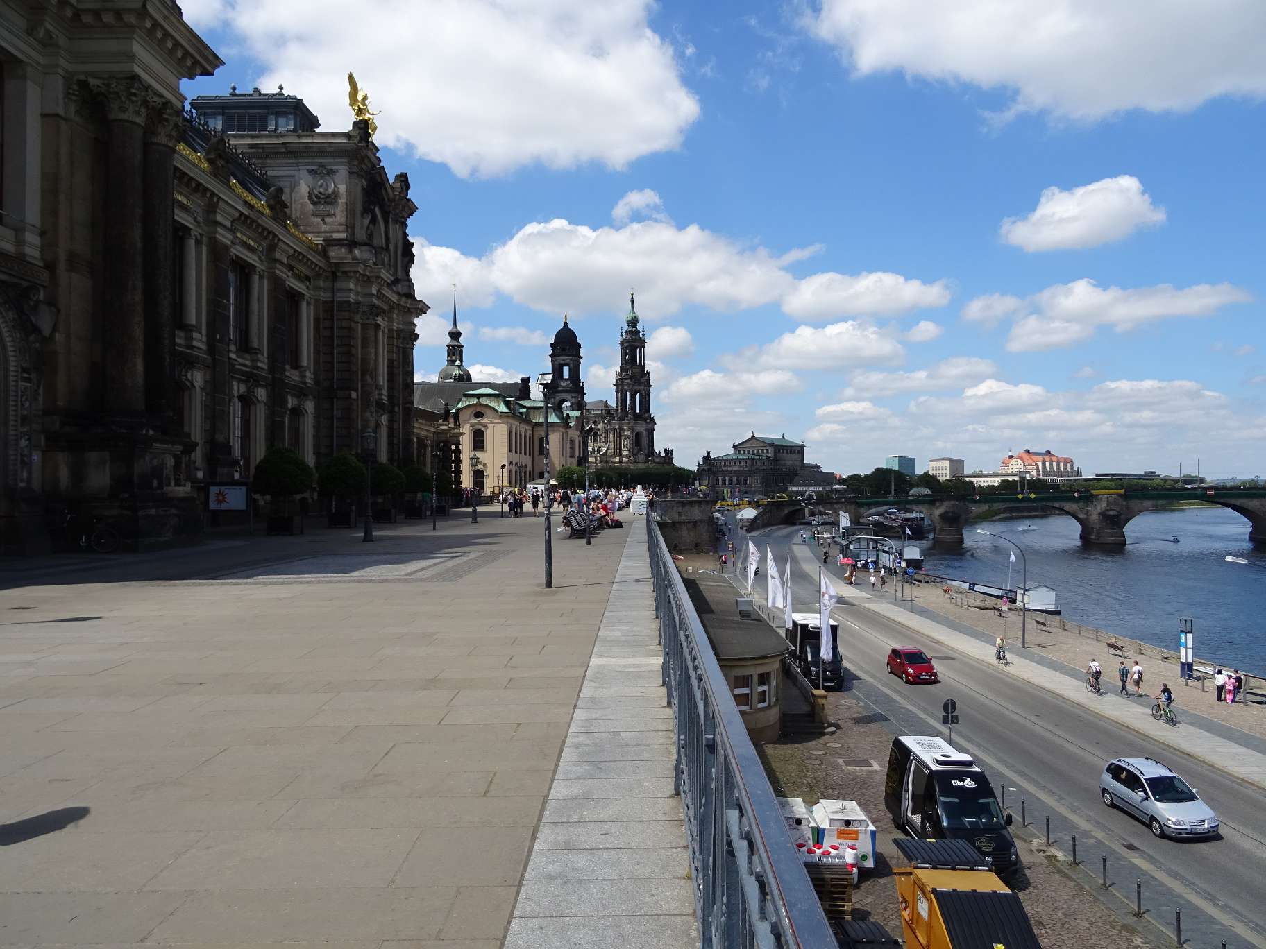 Zwischen Fürstenzug und Elbe kann man auf der Brühlschen Terrasse schlendern und auf die Elbe hinuntersehen. Am gegenüberliegenden Königsufer sind die alten Regierungsgebäude, zum Teil haben sie heute noch diese Funktion, zu sehen.