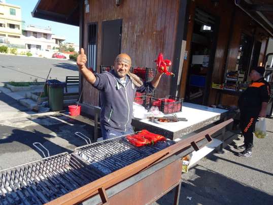 Bei einem Fischhändler in Letojanni lagen schöne große Kalmare auf dem Ladentisch, das Kilo für 7,-€. Die Tiere hatten ein Gewicht von knapp zwei Kilo und wir ließen sie ausnehmen, weil das doch eine ziemliche Schweinerei ist. Abziehen mussten wir sie jedoch selbst. Das ist nicht weiter schwierig.