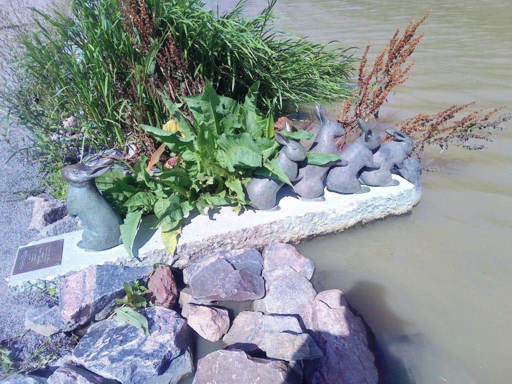 Vom Campingplatz sind es nur ca. eineinhalb Kilometer bis in das Zentrum von Söderköping, zuerst über die Klappbrücke und dann immer am Ufer des Kanals entlang. Kurz bevor der Trubel am Ufer losgeht, überrascht eine kleine Gruppe Kaninchen am Ufer. Es ist ein Kunstwerk mit dem Namen „Kaninchen-Überquerung“. Am diesseitigen Ufer helfen die angekommenen Kaninchen einem anderen, welches gerade das Ufer erreicht hat, heraus. Am gegenüberliegenden Ufer springt gerade eines ins Wasser, andere wollen folgen, ganz niedlich.