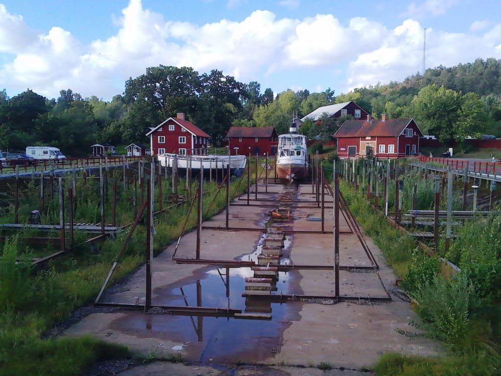 Von dort oben führt ein Weg mit vielen Stufen hinunter zum Kanal. Wir spazierten zum Parkplatz zurück und fuhren zum Campingplatz Skeppsdockan. Der Platz ist großzügig und offen gestaltet und liegt direkt am Göta-Kanal. Ein Trockendock wird vom Platz umschlossen. Gerade liegt ein altes Kanalboot aufgedockt darin.