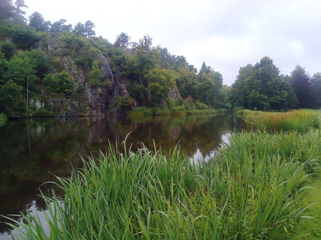 Hinter dem Kurpark steigen Felsen auf. Unterhalb der Felswand wurde ein großer Teich angelegt. An einer Stelle stürzt ein kleiner Wasserfall von oben in den Teich.
