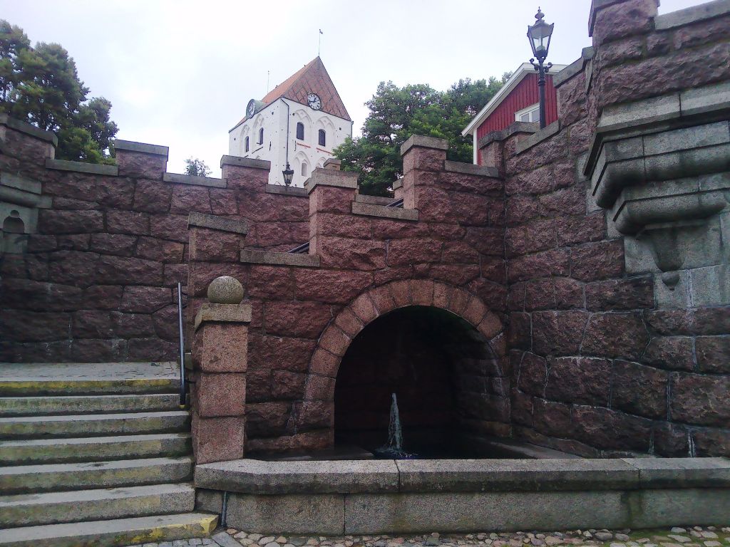 Ganz in der Nähe steht die Heliga Kors Kyrka aus dem 12. Jahrhundert. Mittelalterliche Kalkmalereien im Inneren machen diese Kirche besonders. Unterhalb der Kirche wurde eine Art Mauer mit einer Brunnennische errichtet, in einem vollkommen anderen Stil. Eine Infotafel erklärt, dass die Stadt Ronneby bis 1658 unter dänischer Herrschaft stand.