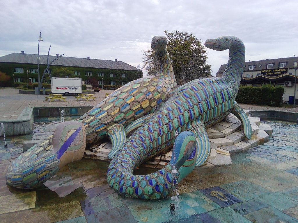 Nach einer Übernachtung auf dem Stellplatz am Bootshafen in Norje, gegen eine Spende, fuhren wir nach Bromölla weiter. Wir parkten das Wohnmobil auf dem Parkplatz Pyntvägen, der direkt am Ufer das Ivösees liegt. Von hier aus sind es nur siebenhundert Meter bis zum „Scanisaurus“-Brunnen. Dieser Brunnen wurde wunderschön mit aufwändig gestalteten Keramikfliesen errichtet.