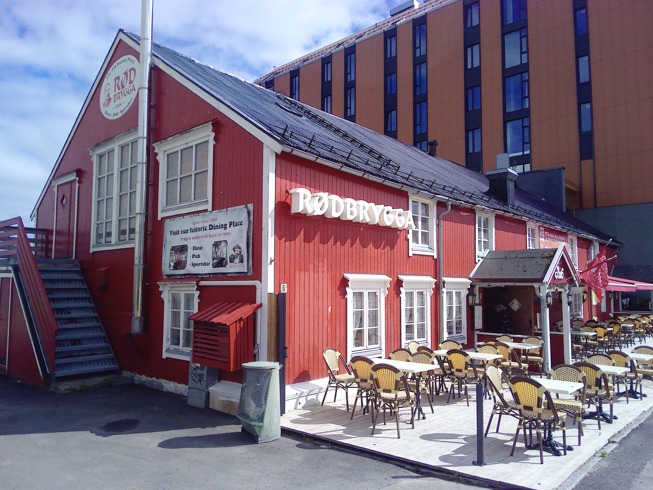 Gleich neben dem Hurtigruten-Museum steht ein altes Gebäude „Rødbrygga“, rot angestrichen mit weißen Fenster- und Türrahmen, ganz traditionell. Es stammt aus dem Jahre 1906 und ist ein Pub. Wenn man dort eintritt reist man in der Zeit zurück. Wie in einem richtigen Pub gibt es überall etwas zu sehen. Decken und Wände sind mit alten Dingen, Fanartikeln oder Souvenirs dekoriert. Die Bestellung wird am Tresen abgegeben und später an den Tisch gebracht. Bezahlt wird im Voraus. Bei uns war gerade wieder eine Kaffeepause dran, also bestellten wir Waffeln mit Erdbeeren und Sauercreme. Die Erdbeeren waren zwar Marmelade, aber die Waffeln und auch der Kaffee schmeckten super. Auch vom Preis her kann man sich nicht beschweren, denn die Waffeln kosten nicht mehr als in Deutschland.