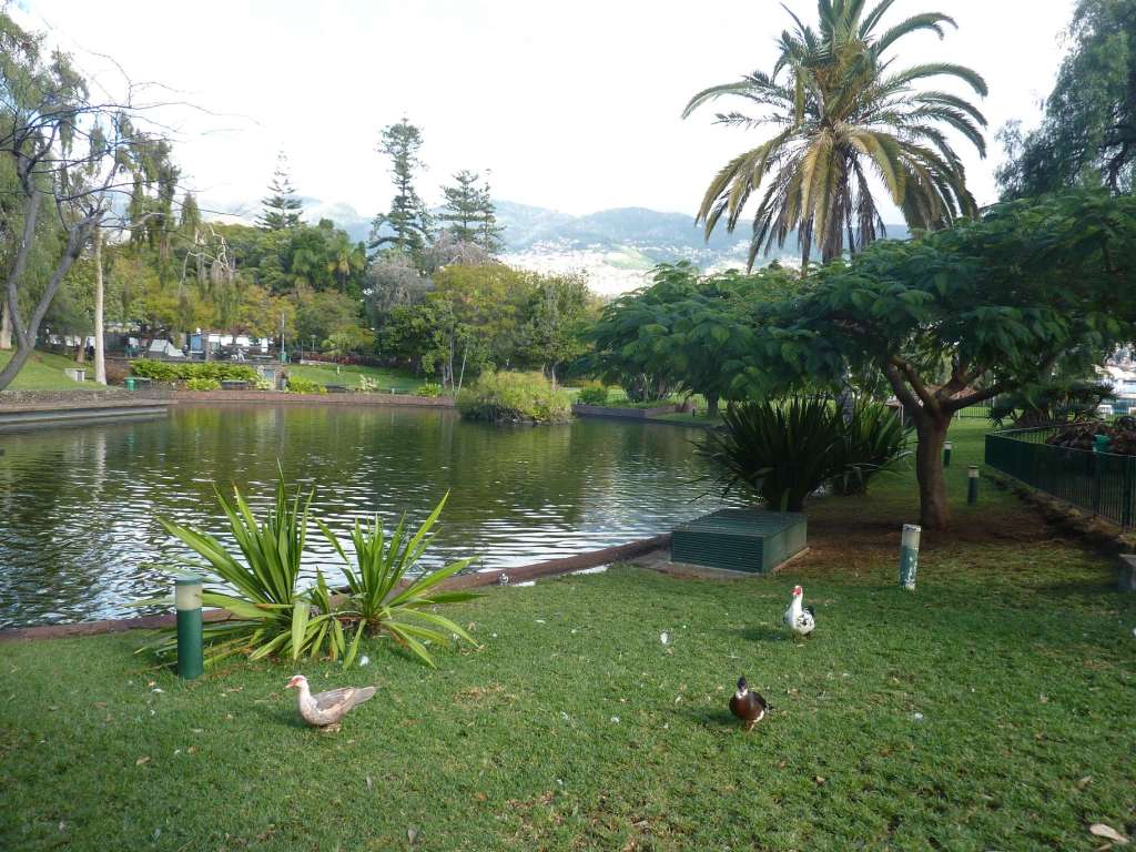 Oben angekommen, ist der Park Santa Catarina in verschiedene Bereiche aufgeteilt, so dass jeder sein gemütliches Fleckchen zum Ausspannen finden kann. Sogar einen Teich mit Enten darauf gibt es. Über den Bäumen des Parks sind die Hügel und Berge auszumachen, die sich um Funchal erheben.