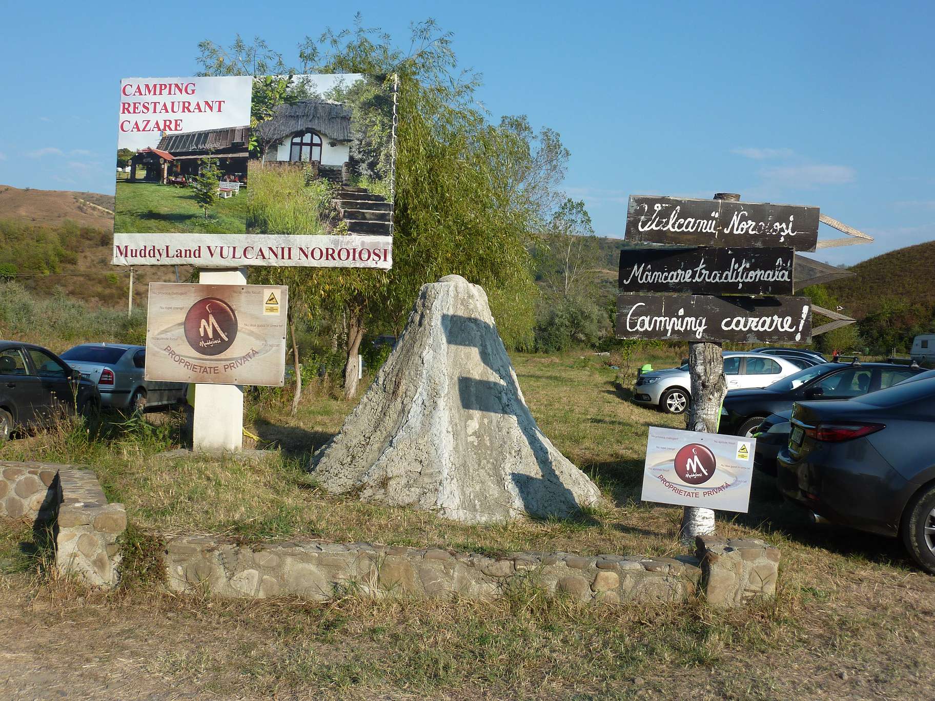 Was den Campingplatz so besonders macht, ist die Tatsache, dass von hier aus beide großen Schlammvulkanfelder zu Fuß zu erreichen sind. Das kleine Feld liegt nur etwa 400m einen Hügel hinauf. Der Eintritt kosten 4,-Lei, nicht einmal 1,-€. Dann liegt das graue Schlammvulkanfeld vor dem Besucher. Es ist unspektakulär, aber sehr interessant. Hier bilden viele kleine Schlammlöcher ein großes Feld. Aus jedem dieser Schlammlöcher, oder schon Schlammvulkankegeln, blubbert das Gas, auf einer Infotafel als Petroleum mit ganz viel Gas bezeichnet, an die Luft. Rauchen oder Feuer sind natürlich strengstens verboten.