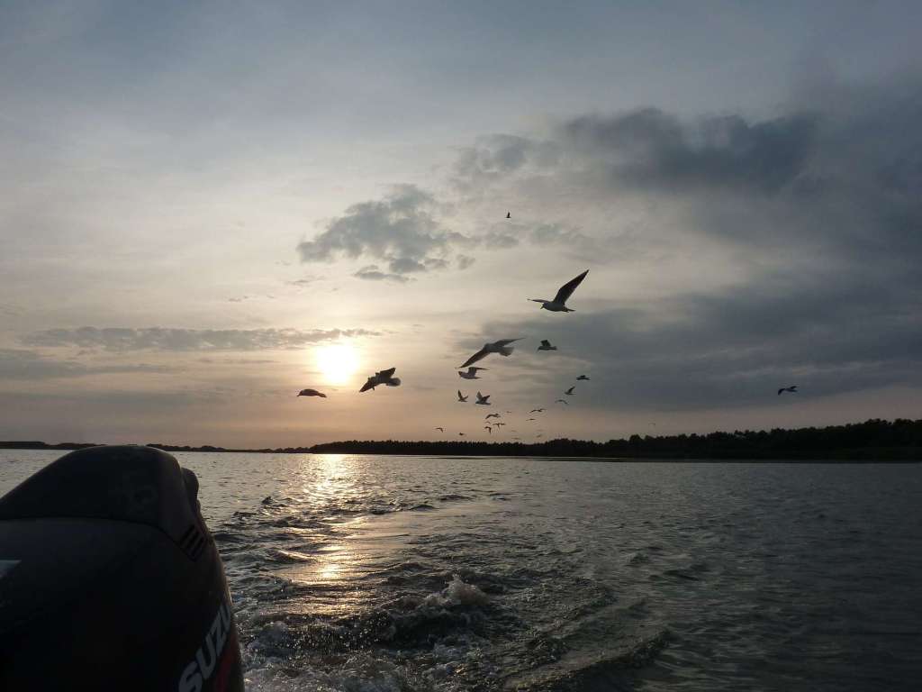 Als wir in einen See einbogen, wirbelte der Motor des Bootes die Wasserpflanzen auf und eine Schar Möwen flog hinter uns her, um etwas Fressbares dazwischen zu finden. Im Hintergrund ging gerade die Sonne auf, ein unglaublich schönes Bild.