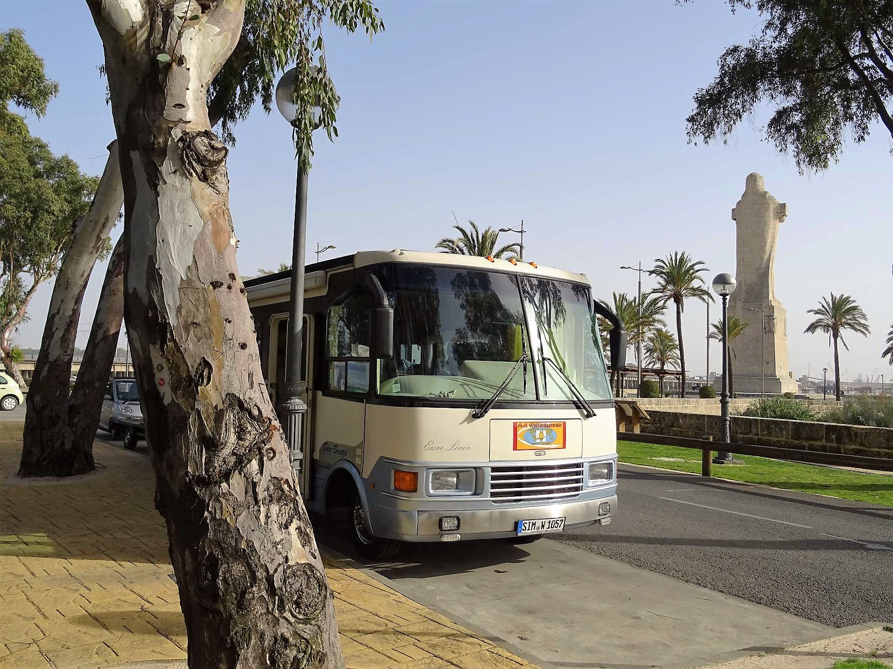 Auf der Suche nach einem Stellplatz, von dem aus wir Sevilla besuchen konnten, brachte uns nach Dos Hermanas knapp südlich der Hauptstadt Andalusiens. Direkt an der Bahnstation Cantaelgallo am Westrand von Dos Hermanas sind zwei sehr große Parkplätze zu finden. Hier steigt man direkt in die Linie C1 der Gesellschaft renfe und ist in einer viertel Stunde im Zentrum von Sevilla. An der Station San Bernardo steigt man wieder aus. Die Fahrt hin und zurück kostet für zwei Personen 5,30€. Von der Bahnstation in Sevilla ist es dann noch ein Fußweg von einer viertel Stunde bis zur Kathedrale.