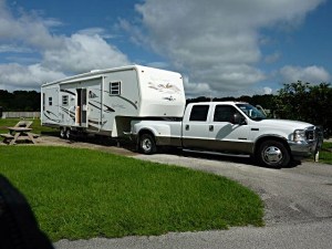 Bei der Planung unserer USA-Rundreise kauften wir ein Gespann, bestehend aus einem Truck Ford F350 und einem Sattelauflieger River Canyon von Travel Supreme. Dieser Sattelauflieger entsprach einer 20 m²-Wohnung auf Rädern, mit Wohnzimmer, Küche, Bad, Schlafzimmer, Computerecke und Wachmaschine. Das 5th-Wheel stellten wir auf den Campingplätzen ab und fuhren mit dem Truck die verschiedenen Ziele an.