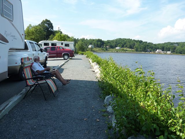 Der Ort Trois Pistoles war für uns das Tor zum St. Lorenz Strom, der an dieser Stelle immer noch um die 21 km breit ist (aus der Karte gemessen). Die Stadt wird von der Notre-Dame-de-Neiges dominiert, die einen auffälligen Baustil hat. Eine Fähre bringt Fahrzeuge und Passagiere zum anderen Ufer des St. Lorenz Stromes. Der Fahrpreis für unser Gespann zwang uns diesmal sogar zur Routenänderung. Eigentlich wollten wir hier übersetzen und auf der westlichen Seite nach Quebec fahren, wo einige touristische Highlights auf uns gewartet hätten, wie Tadoussac, das Mekka der Walbeobachtung, und der St. Anne Canyon.
