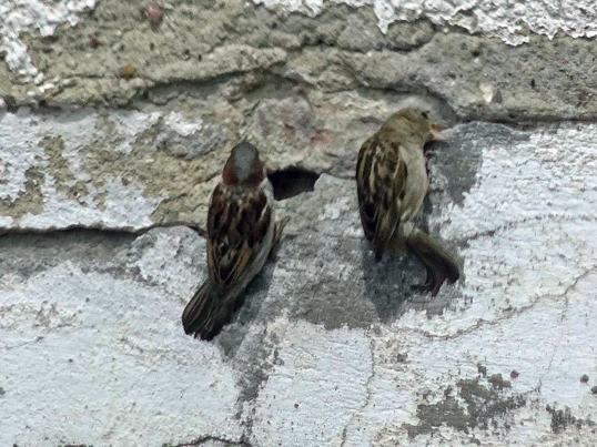 Worauf wir aber im Leben nicht gekommen wären, ist, den Vögeln etwas Putz mit möglchst viel Kalk darinnen, anzubieten. Wie wir jetzt sehen, sind die Spatzen sehr erpicht darauf. Anfangs dachte ich, ich bin nicht mehr ganz klar im Kopf, als die grauen Flecken in der weißen Hauswand immer größer wurden. Bis ich eines Tages sah, wie sich ein Spatz immer wieder an der Hauswand festkrallte und den Putz aus der Wand pickte. Inzwischen hat sich das heraumgesprochen und die Löcher erweitern sich weiter.