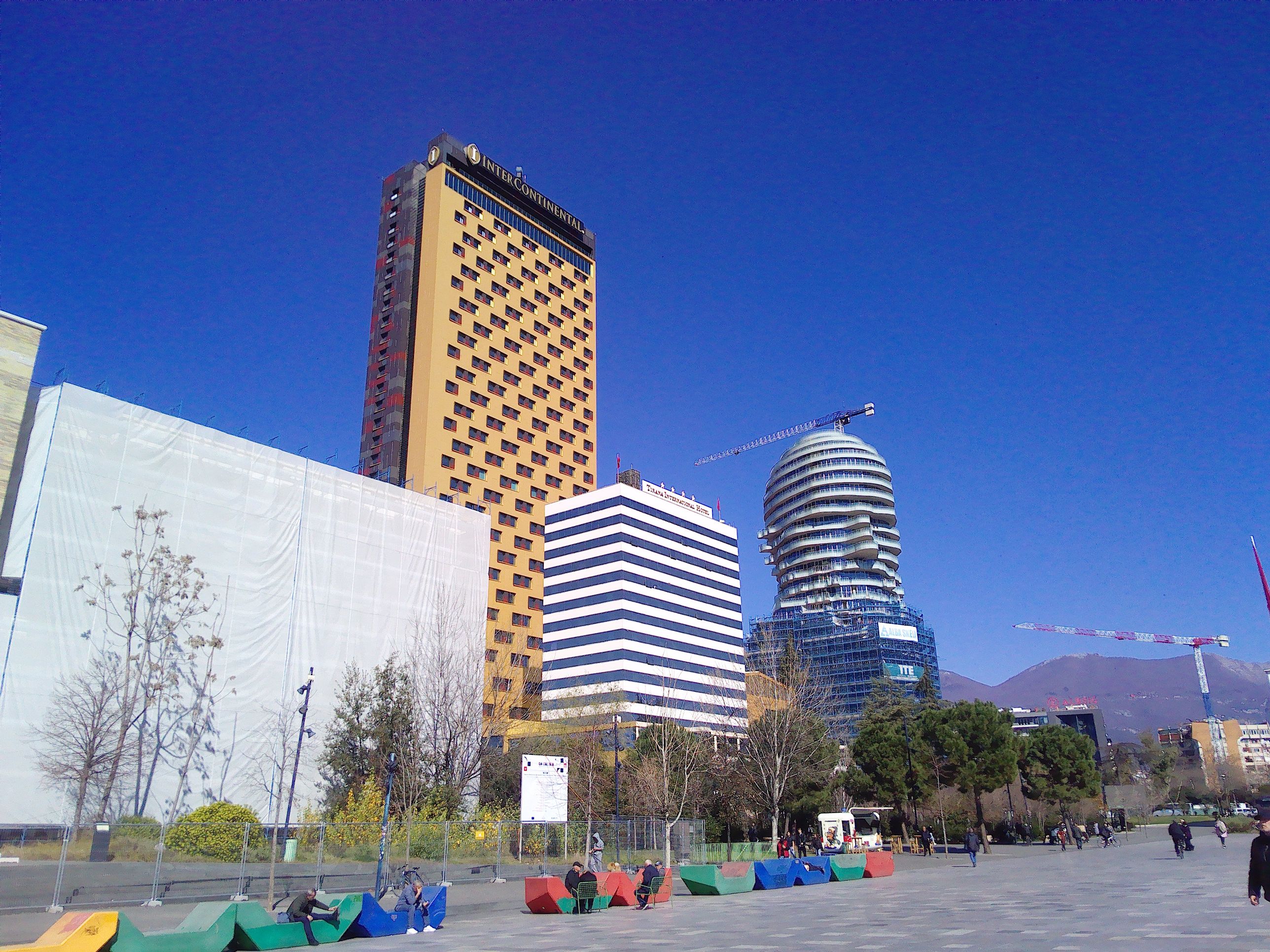 Um den Platz herum finden sich architektonisch auffällige Bauten, wie das Sheshi skenderbeut, dessen nagelneue Fassade wie ein Kopf geformt ist und ein Gesicht hat.