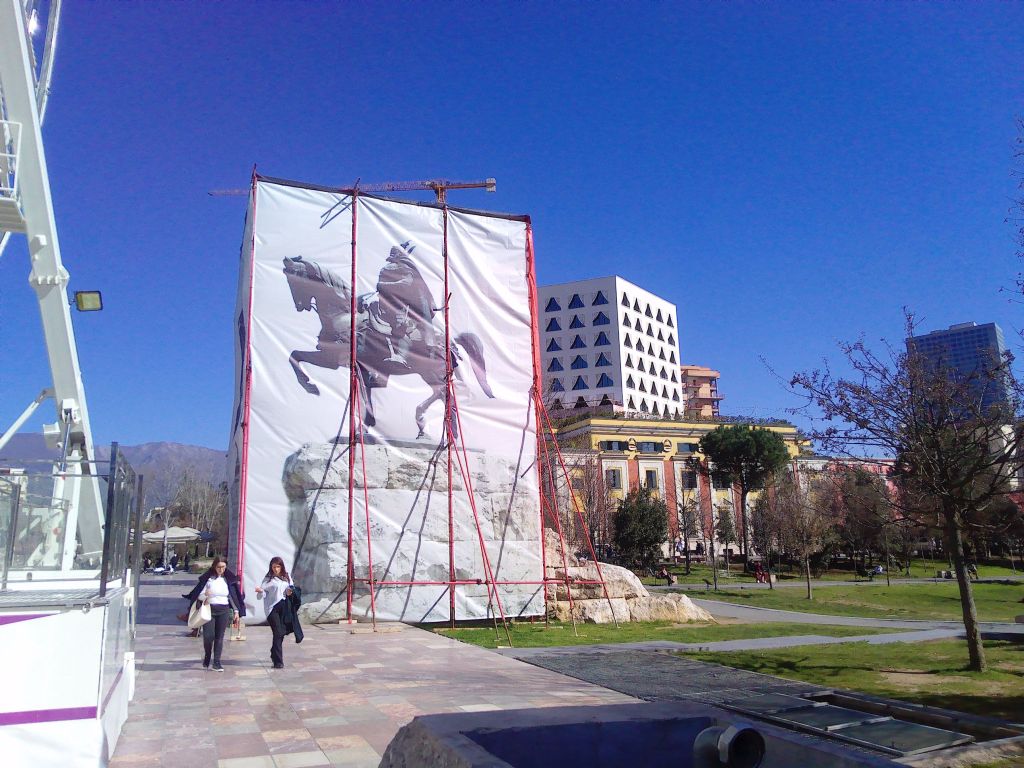 Der Kulturpalast, die Oper, das Theater, das Historische Museum und die Et´hem-Bey-Moschee prägen das Bild des Platzes. Leider ist das Skanderbeg-Reiterstandbild gerade verhüllt. Skanderbeg ist der Nationalheld Albaniens. Er befreite das Land im 15. Jahrhundert von der osmanischen Herrschaft.