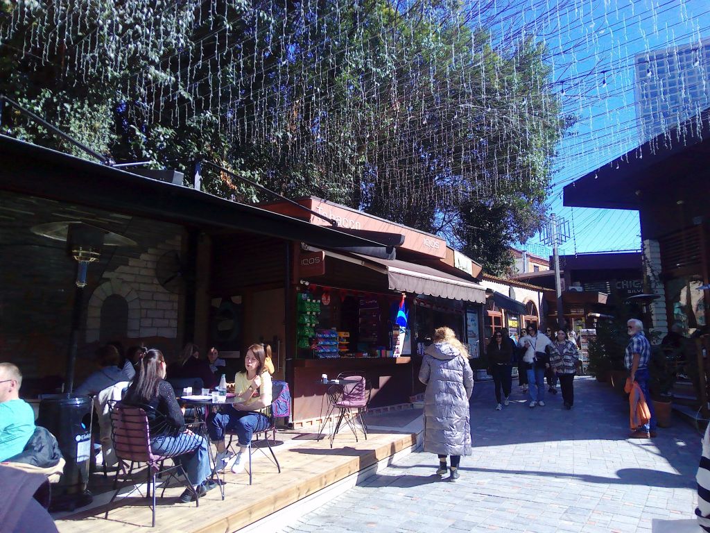 Dann bogen wir in die Rruga Vilson ein und erreichten so das farbenfrohe und geschäftige Altstadtviertel. Die Kole Idromeno Straße ist das Aushängeschild. Es ist eine Fußgängerzone mit vielen Straßencafés und kleinen Läden. Trotzdem sind dort auch Fahrräder und sogar Mopeds unterwegs, die sehr störend sind. Die Polizei ist zwar überall unterwegs, aber die kontrollieren lieber die Autofahrer, als sich mit solchen „Kleinigkeiten“ abzugeben.