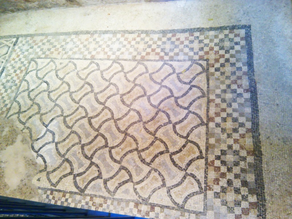 Auf der anderen Seite führt eine Treppe hinauf zu den Resten der Anlage. Tore, mehrere Stockwerke hohe Mauern, Säulen und Mosaiken lassen auf die ehemalige Pracht schließen.