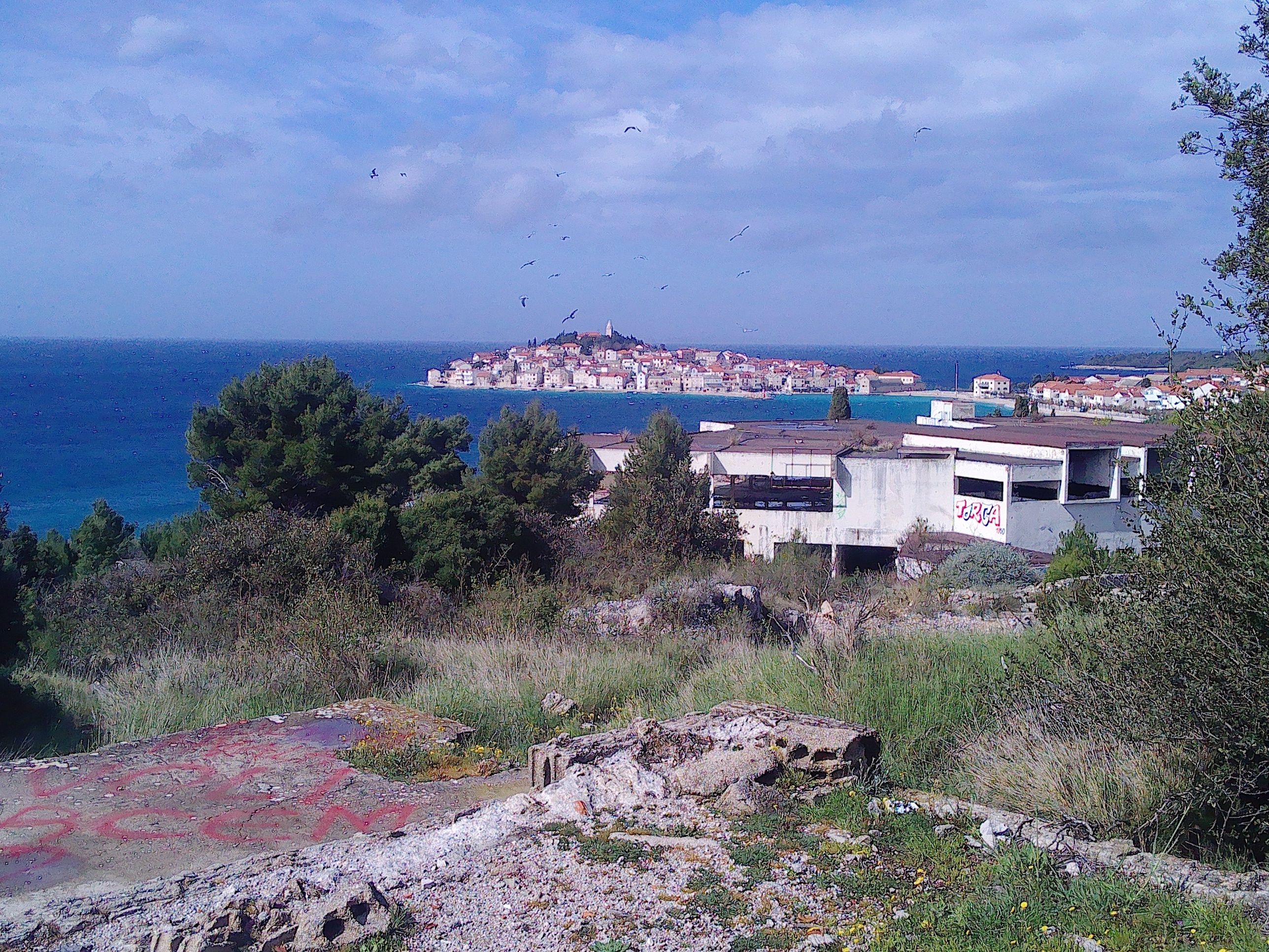 Der Strand ist der Abschluss einer kleinen Ebene, hinter der sich die Berge erheben, die das Bild an der kompletten Adriaküste bestimmen. Die höchsten Gipfel etwas weiter in Landesinneren sind schneebedeckt. Die Vegetation in dieser Gegend ist genauso grau wie in Deutschland, aber ist dieser einen Monat voraus. Viele Bäume zeigen jetzt das erste Grün.