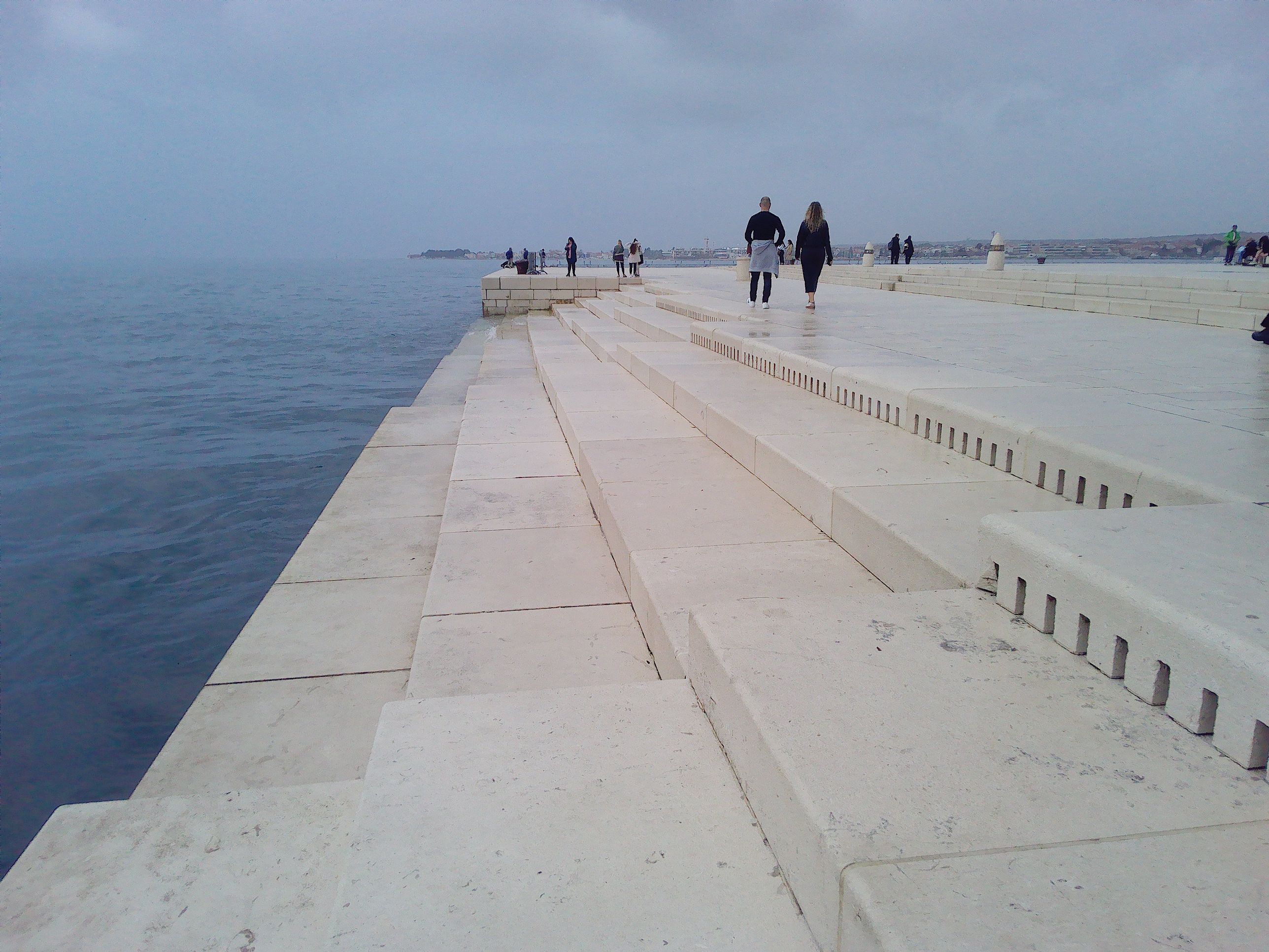 Dann spazierten wir an der Promenade entlang bis zur Meeresorgel. Schon aus einiger Entfernung hörten wir die Töne, die durch die Wellen über die Meeresorgel entstehen. Wir waren verwundert, dass diesmal die Töne so laut waren, obwohl das Wasser relativ ruhig war. Fasziniert lauschten wir der „Musik“ und genossen die Sicht über das Meer und die vorgelagerten Inseln.