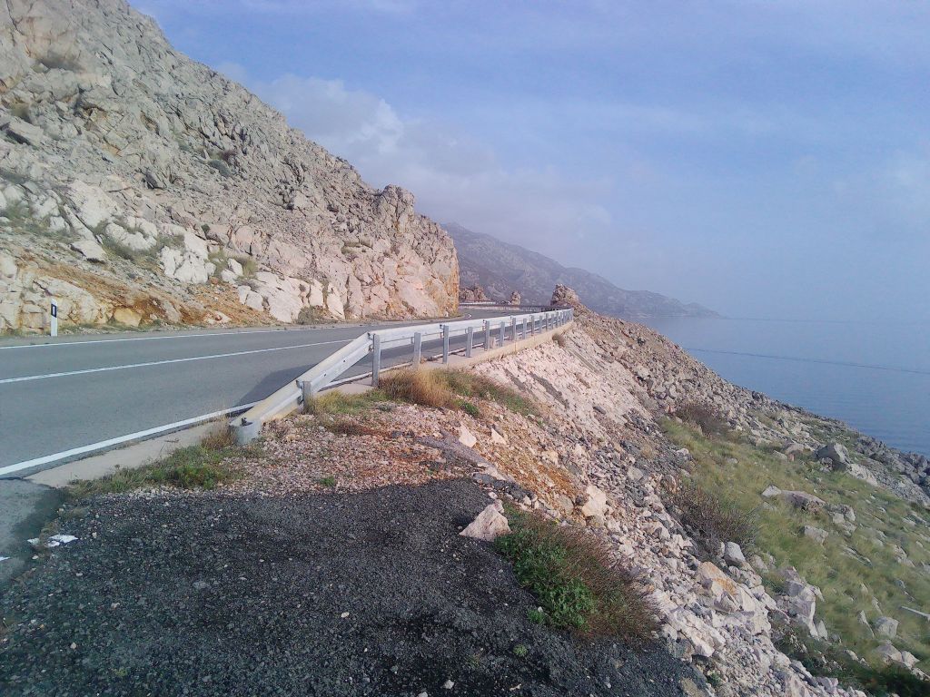 Die Regenpause dauerte gerade so lange wie unser Spaziergang. Deshalb setzten wir unsere Fahrt nach Norden fort. Von jetzt ab begleiteten uns der Velebit auf der einen Seite und die Insel Pag auf der anderen Seite. Das Karstgebirge Velebit verläuft von Zadar bis nach Senj und gleicht eher einem riesigen Geröllhaufen als einem Gebirge. Es ist nicht ein Stein zu finden den man Felsen nennen könnte. Alles ist sehr bröckelig. Viele Leute bauten ihre Häuser direkt am Fuße des Gebirges, oder gar in die Täler. Wir hätten da sicher keine ruhigen Nächte.