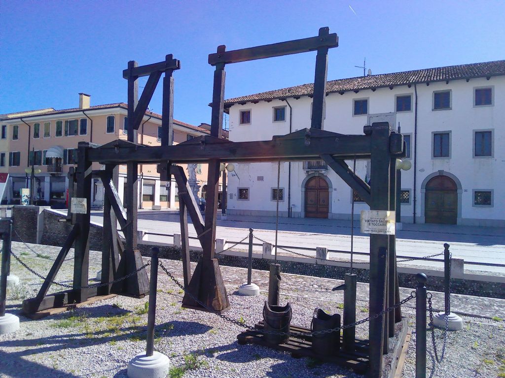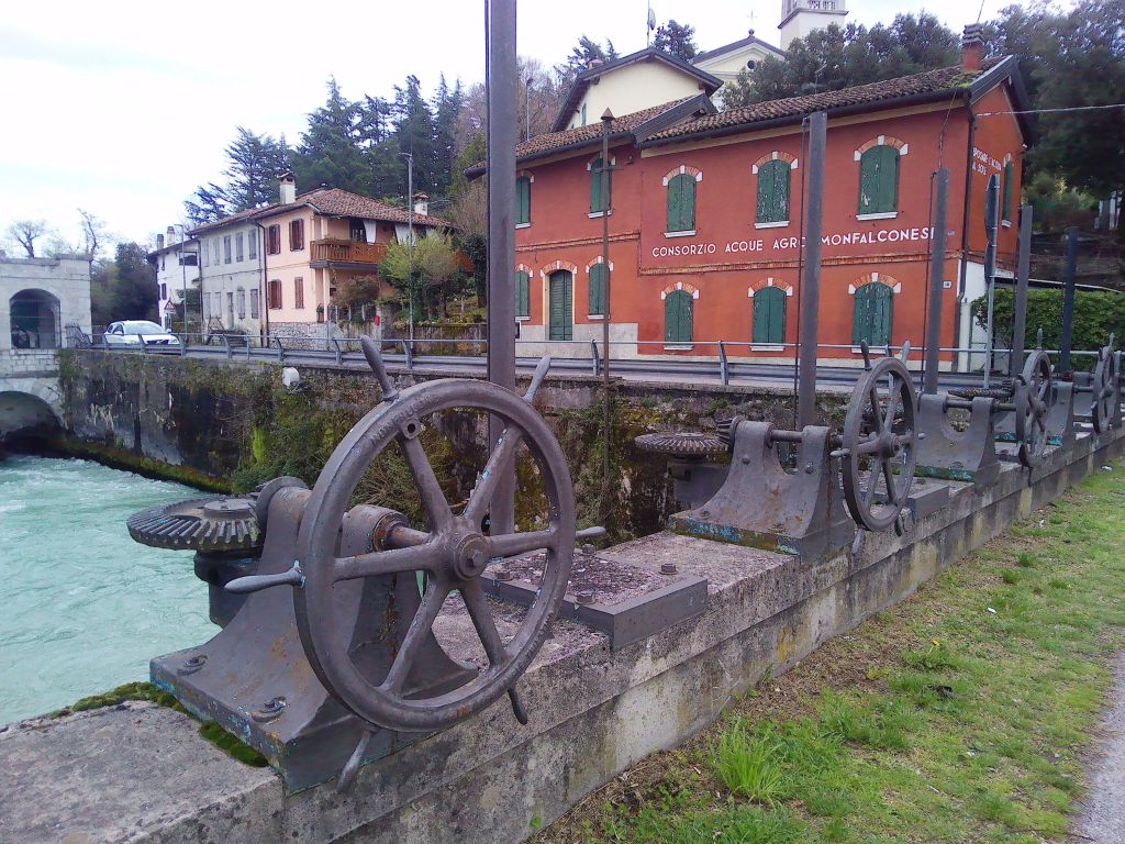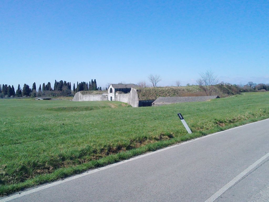 Unser nächstes Ziel war Tarcento, nördlich von Udine. Auf dem Weg dorthin fielen uns zwei Zwischenstationen auf. Beim Durchfahren von Sagrado fiel uns bei der Brücke über den Isonzo-Kanal ein Wasserbauwerk auf. Gleich fuhren wir auf den Parkplatz am anderen Ufer des Isonzo, indem wir die gleichnamige Brücke passierten.
