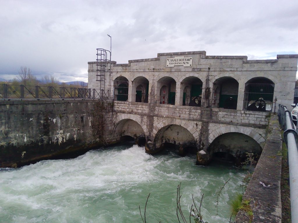 Unser Interesse galt jedoch dem besagten Wasserbauwerk, an dem ein Schild mit der Aufschrift „Canale-Dottori 25. Juni 1905“ angebracht ist. Eigentlich ist es ein architektonisch interessantes Stauwerk, welches Wasser vom Fluss Isonzo in den Dottori-Kanal leitet. Leider gibt es keine weitere Aufklärung.