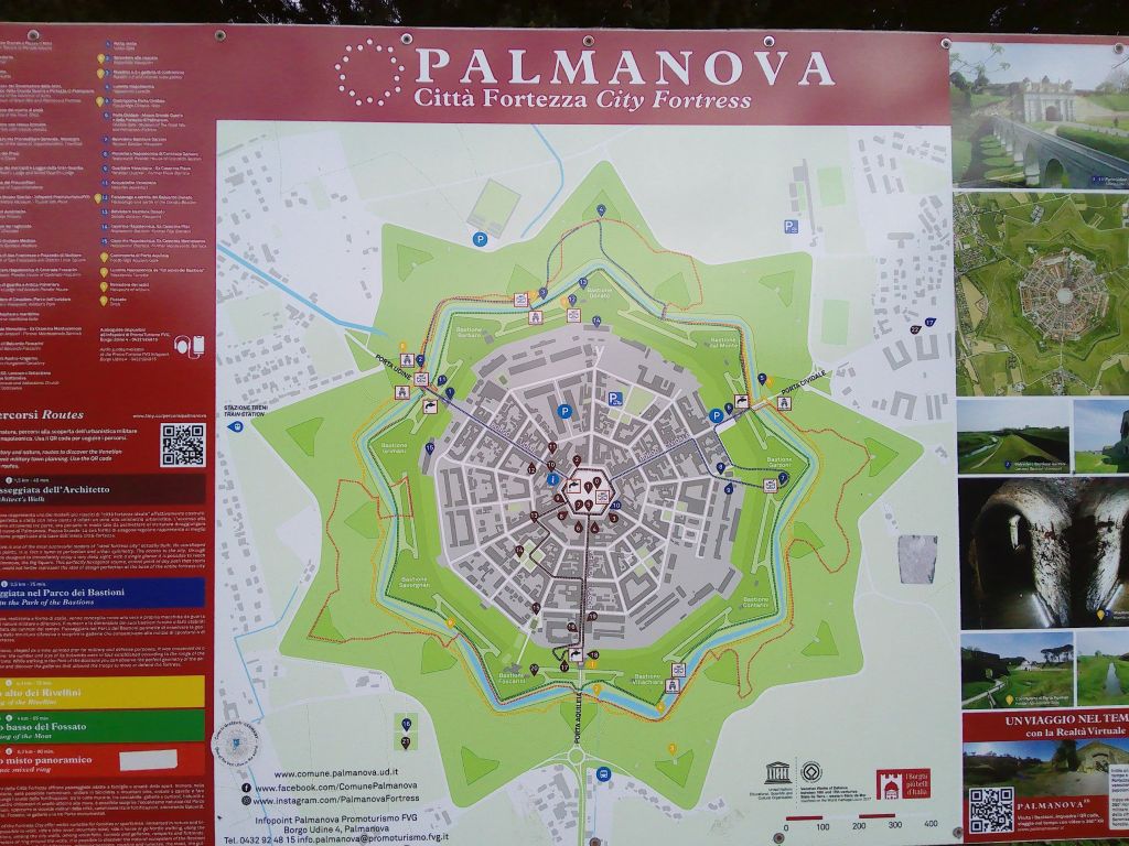 Auf dem Paradeplatz klärt eine Tafel über die Geschichte dieser Stadt auf. Palmanova entstand auf dem Reißbrett. Sie wurde als Festungsstadt konzipiert, um die Verteidigung der friaulischen Ebene, die zur Republik Venedig gehörte, gegen die Türken und auch die Habsburger zu stärken. Die neue königliche Festung sollte ein perfektes Beispiel für die moderne Befestigungstechnik der Spätrenaissance werden. Das Gründungsdatum ist wohl der 7. Oktober 1593. Damals gab es nur die Wälle und Verteidigungsbauwerke. Anfang des 19. Jahrhunderts ergänzte dann Napoleon an den Ecken des Sterns den dritten Verteidigungsring mit den Lünetten. Das sind Befestigungsbauwerke, in denen auch Geschütze aufgestellt wurden.