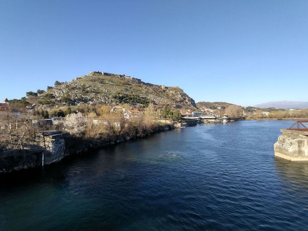Von der nahen Brücke sieht man den Rest der ursprünglichen Stahl-Brücke, die über die Drin führte, und es bietet sich ein schöner Blick zur Burg.