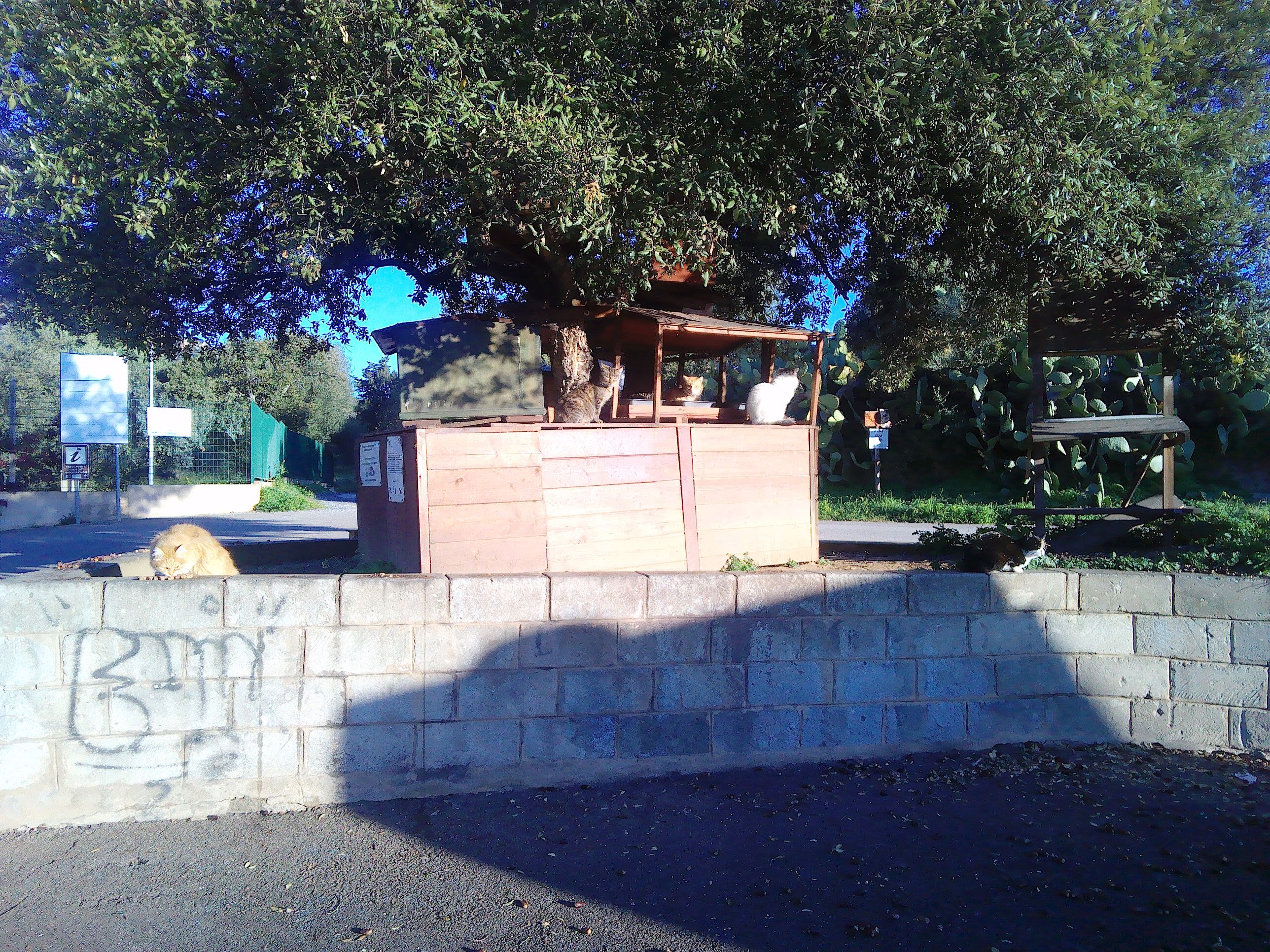 Am Parkplatz steht eine registrierte Katzen-Kolonie. Die Katzen haben dort ein schönes Zuhause in einem Baumhaus und bekommen immer ihr Futter. Denen geht es richtig gut.Wir haben zwar auf Sardinien schon mehrere „Katzen-Fütter-Stationen“ gesehen, aber die hier ist echt nobel.